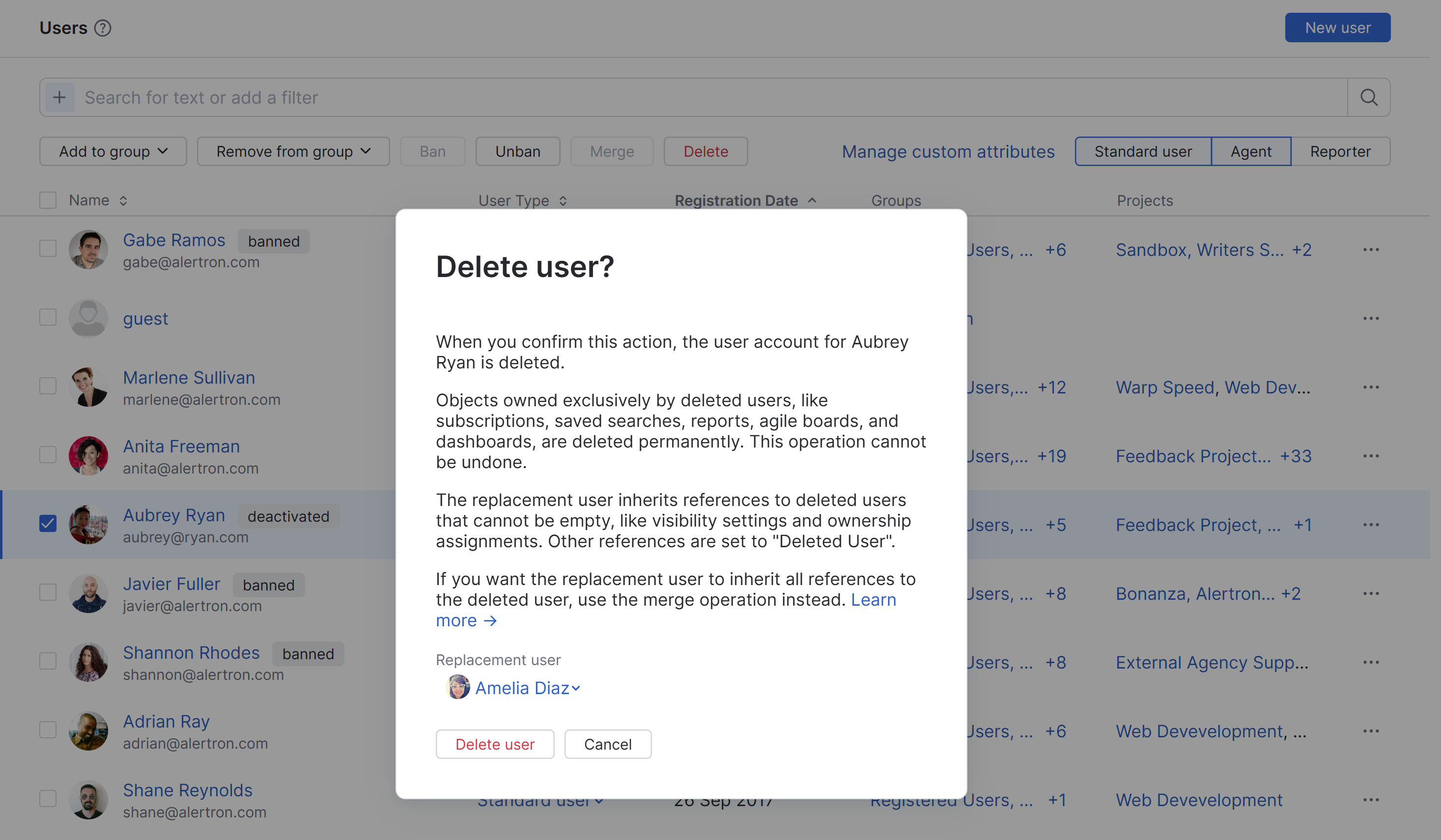 In many cases, deleting a user account results in a loss of information. For example, when you delete a user who has actively reported issues and added comments, you lose the ability to attribute this information to a specific user. We encourage you to delete user accounts only when you truly wish to lose this information. As an alternative, you can: