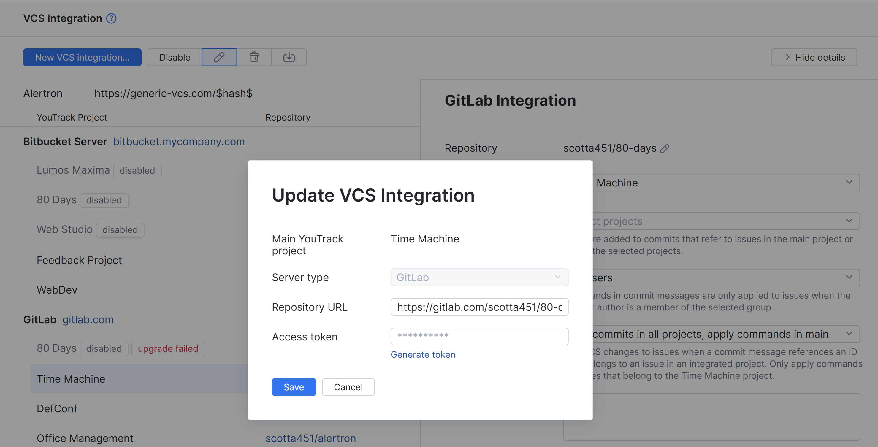 The instructions here are specific to the VCS Integrations page. Project administrators can start from the second step and perform these actions directly on the Version Control page in the project settings. The same Update VCS Integration dialog is shown from both locations.