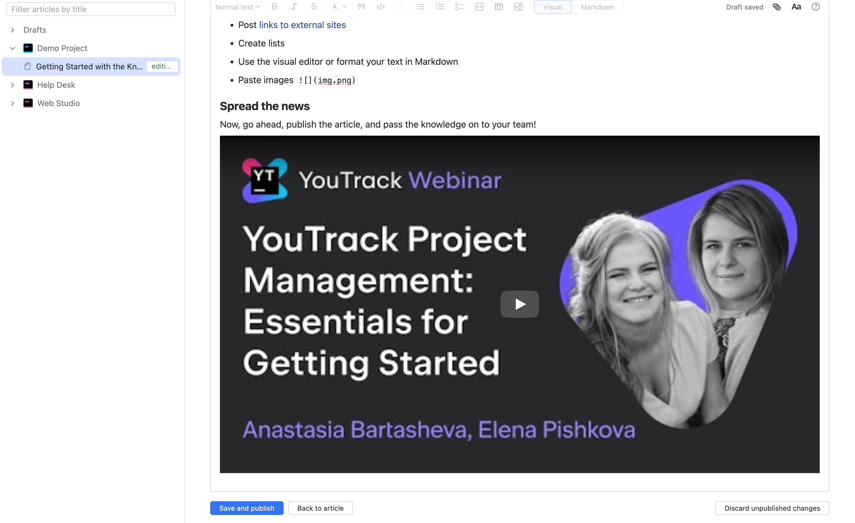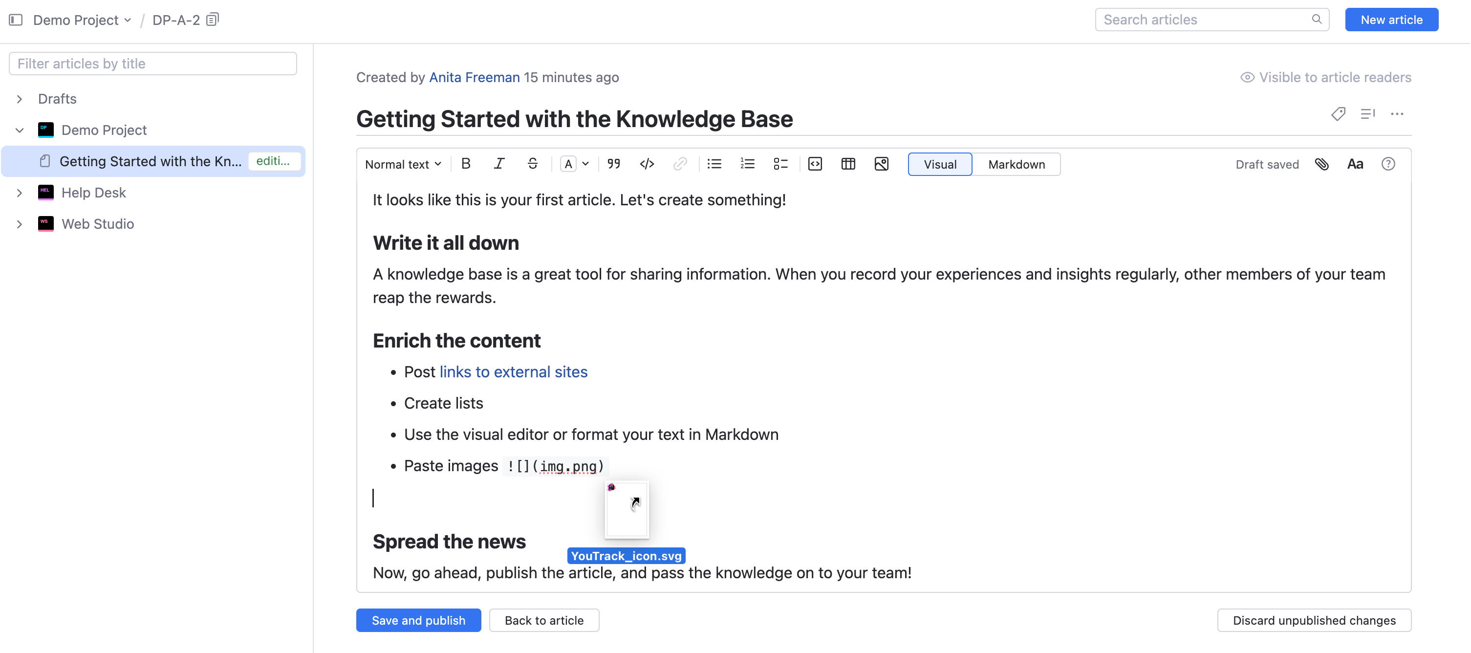 Images, diagrams, photos, and other visual content help to enrich the content in your knowledge base. You can also embed content from external sources directly into your articles.