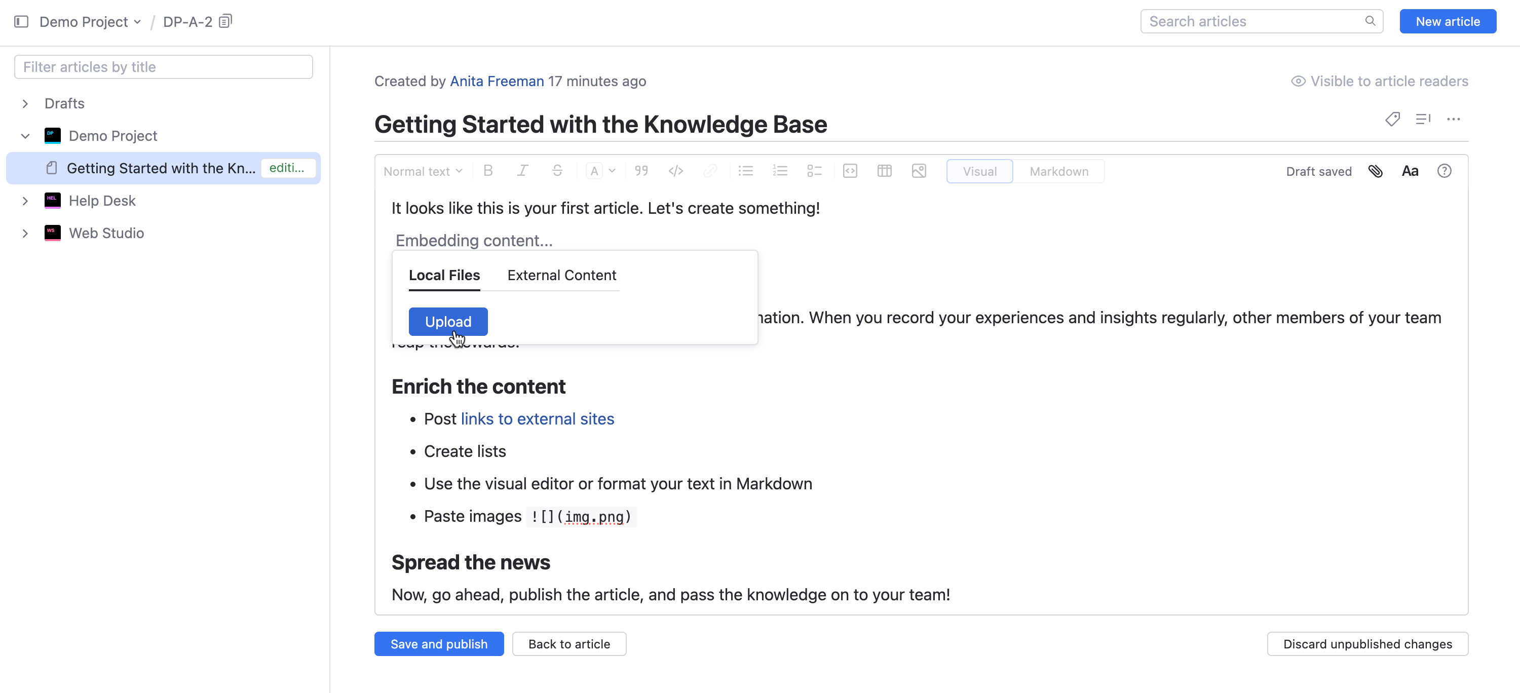 The Upload option lets you search for files in your local directory and insert them into the article content.