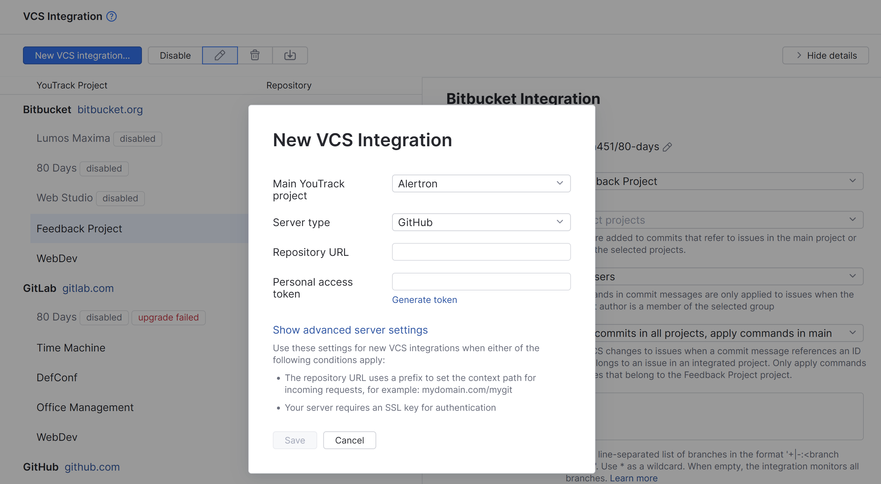 Switch back to the New VCS Integration dialog in YouTrack and paste the token into the Personal access token field.
