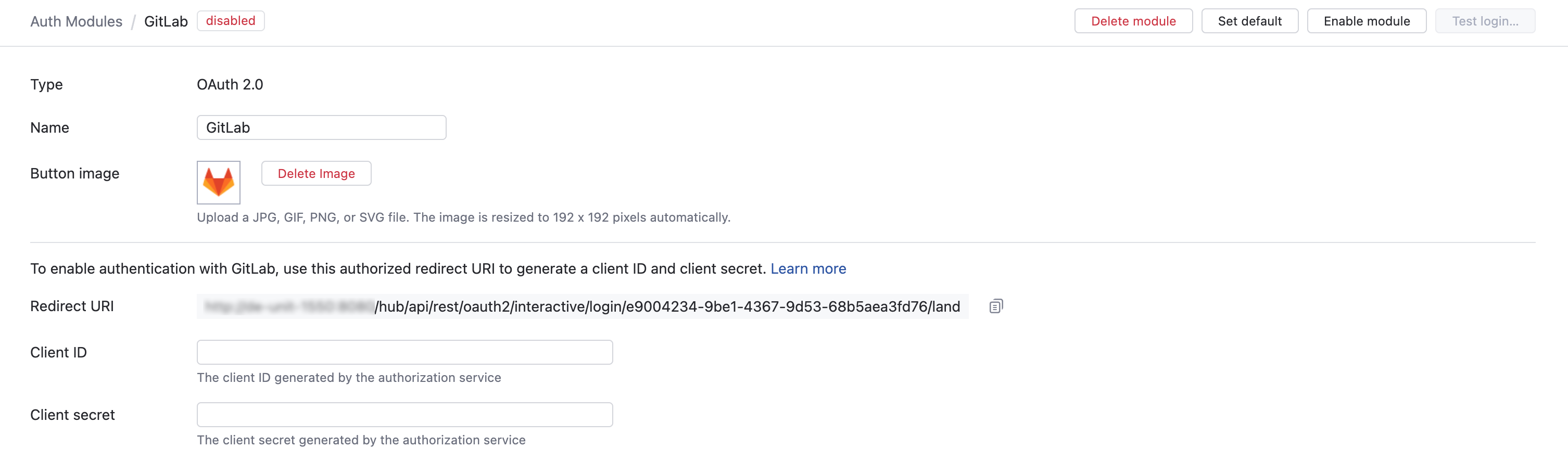 To complete the setup, store the client ID and secret from the authorization service in the GitLab auth module.