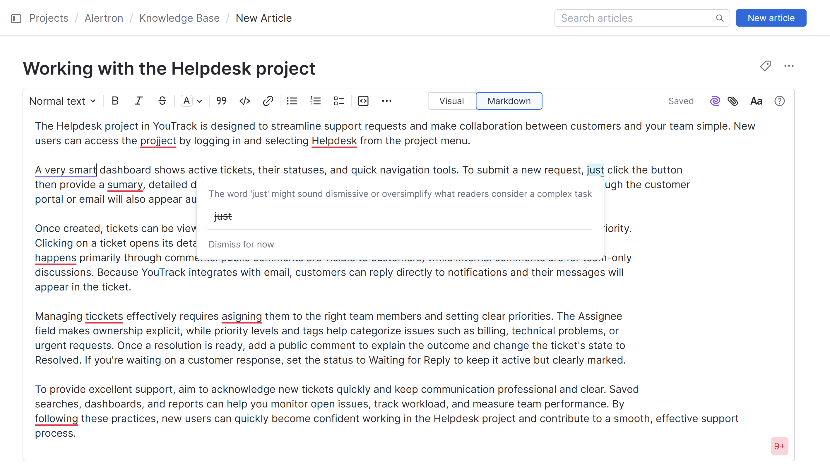 YouTrack provides built-in AI-powered writing assistant tools. These writing assistant tools can improve the clarity and quality of your writing by detecting spelling and grammar mistakes and suggesting ways to rephrase your text. It can also predict what words, phrases, or sentences that you are most likely to use next based on the context.