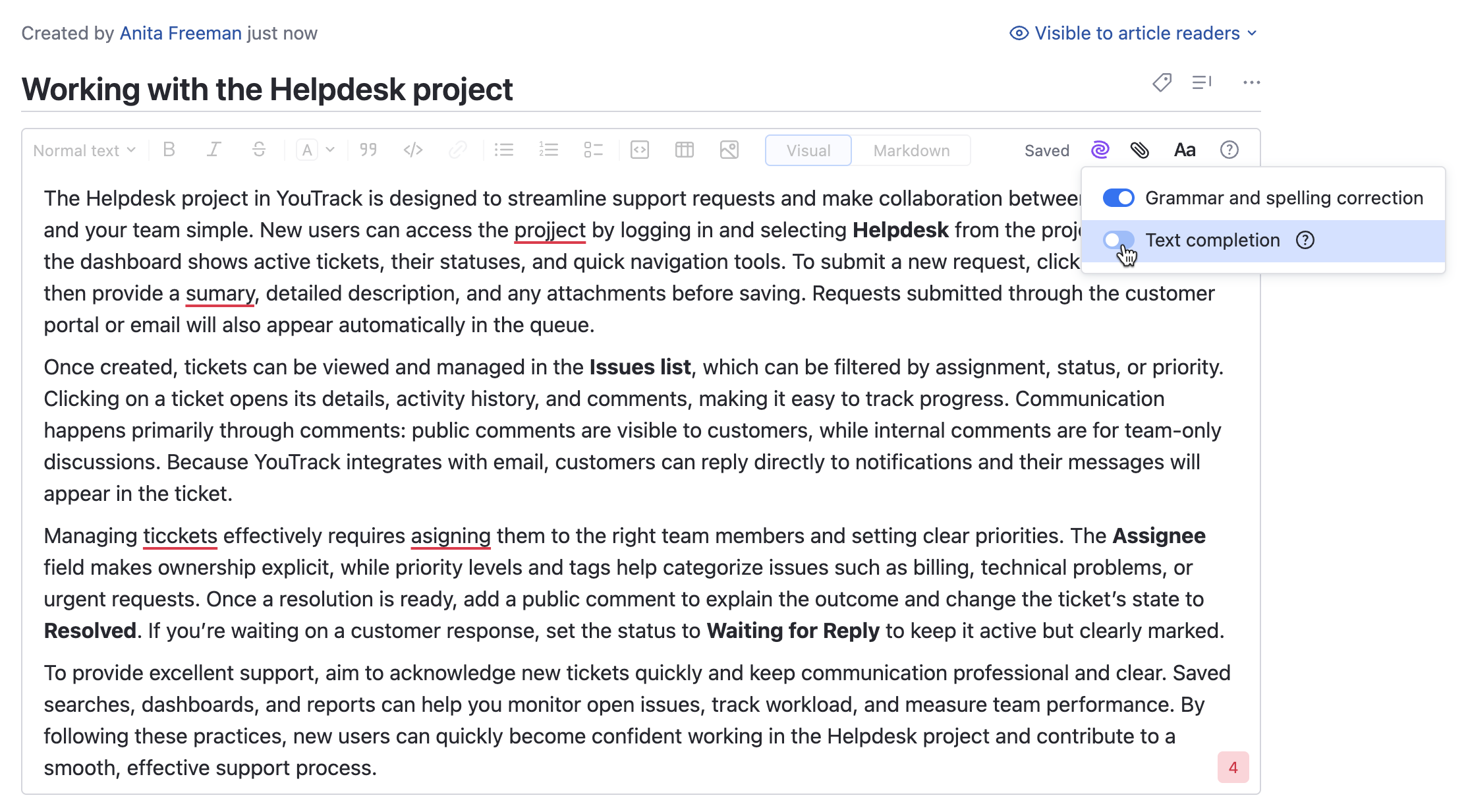 YouTrack's built-in writing assistant features are always there whenever you need them, but can be easily switched off when you don't. The option to toggle the writing assistant features is available from the AI Assistant menu in the text formatting toolbar.