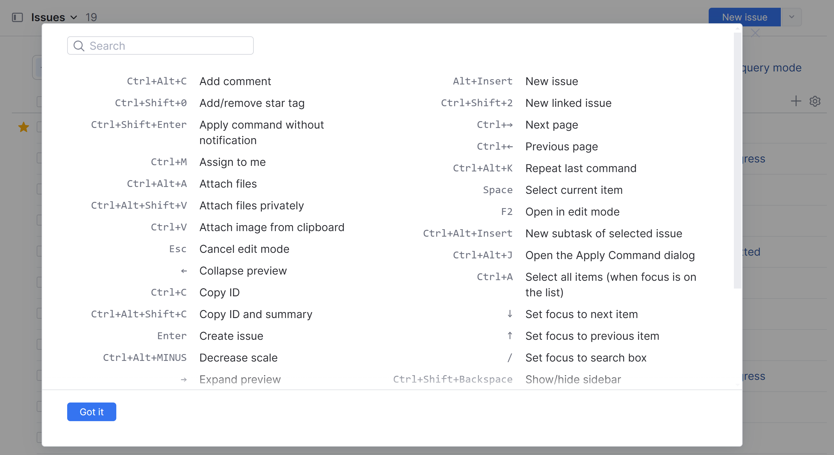 YouTrack supports keyboard-centric navigation through the most frequently used views in the application. Different sets of shortcuts are available in the Issues list, single issue view, agile boards, and dashboards.