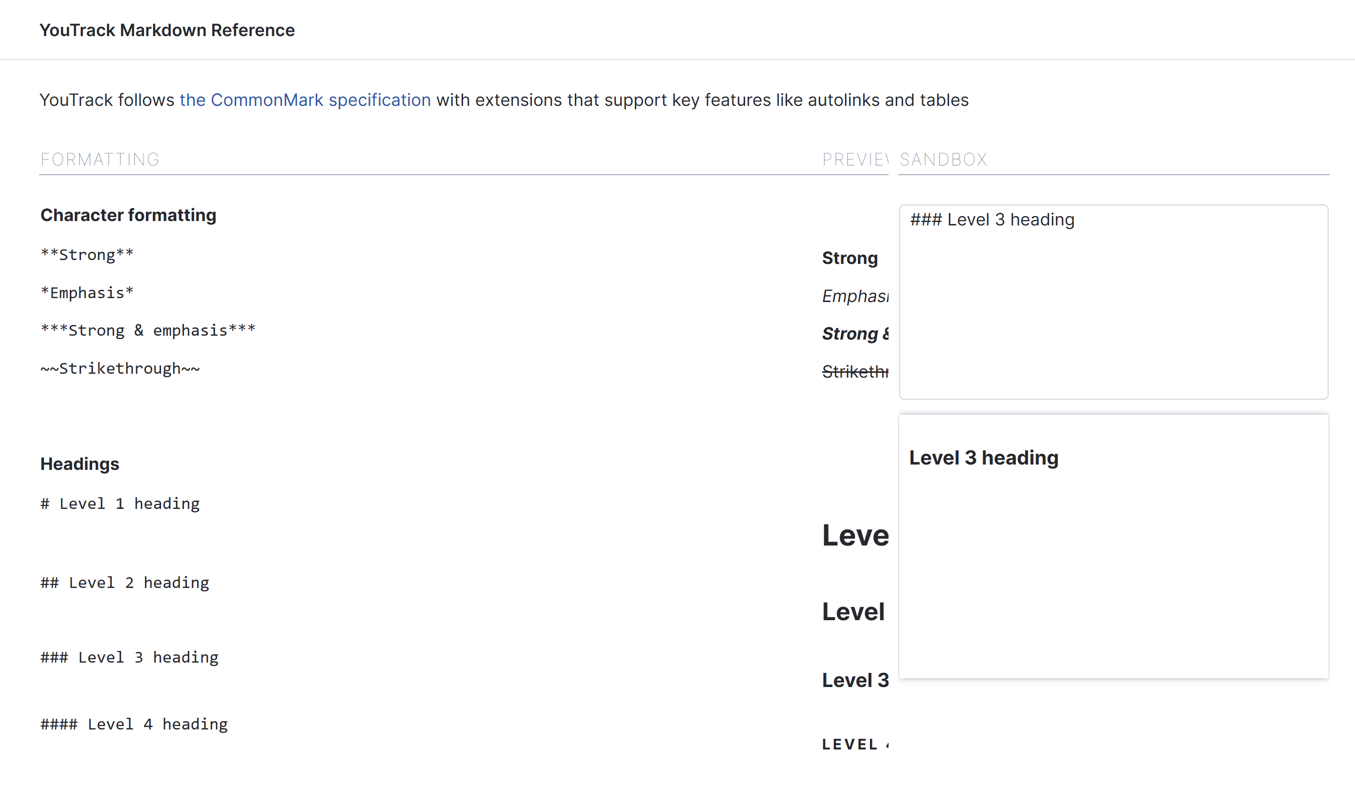 When you click an item in the Formatting column, the example is copied to the Sandbox section of the page. Here, you can experiment with additional formatting options. When you're satisfied with the result, copy the content with markup from the sandbox and paste it into an issue or article.