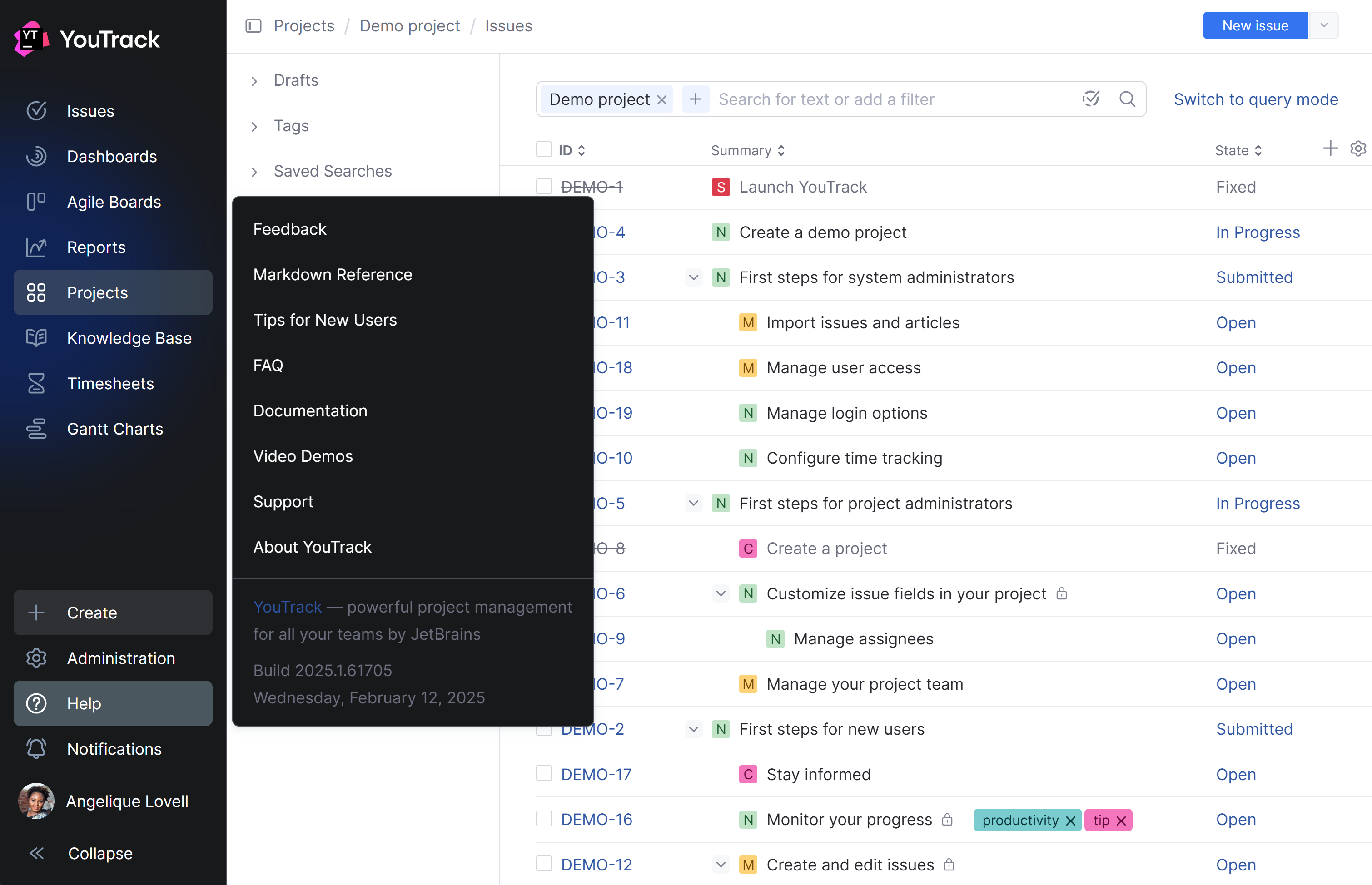 The Help menu in YouTrack gives you direct access to resources that are designed to answer your questions about the product and get the most from the application. By familiarizing yourself with the resources available to you, you'll know exactly where to go for help when you need it.