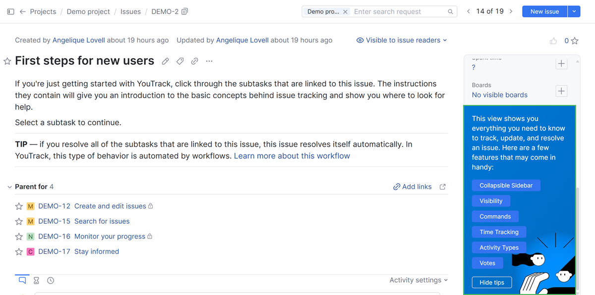 When you first start working with YouTrack, you're shown a collection of onboarding tips. These little hints help you find your way around as you start to work with the application. Hints are shown for the Issues list, in single issue view, and on agile boards.