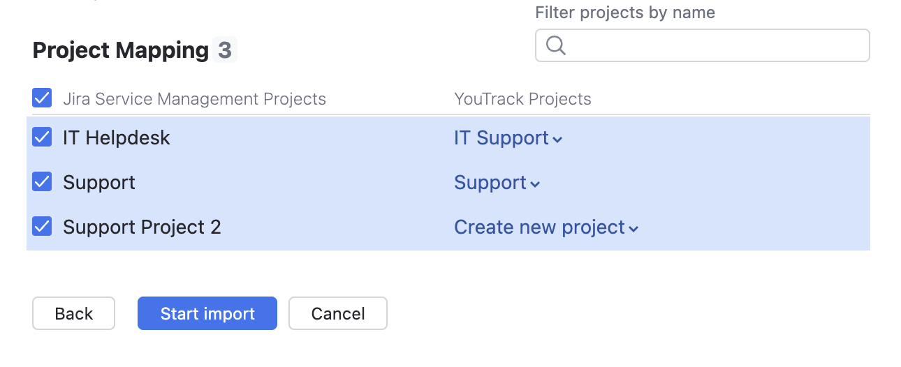 On the final step of the import setup, you can select those Jira Service Management projects that you want to import to YouTrack. You can also decide whether to create a new project for the import or import data into an existing project in YouTrack.