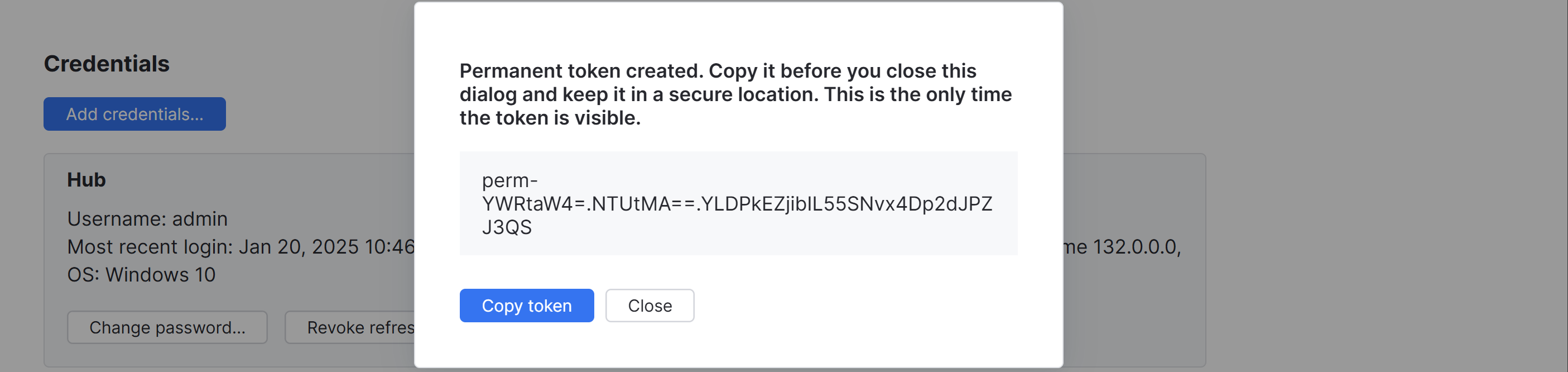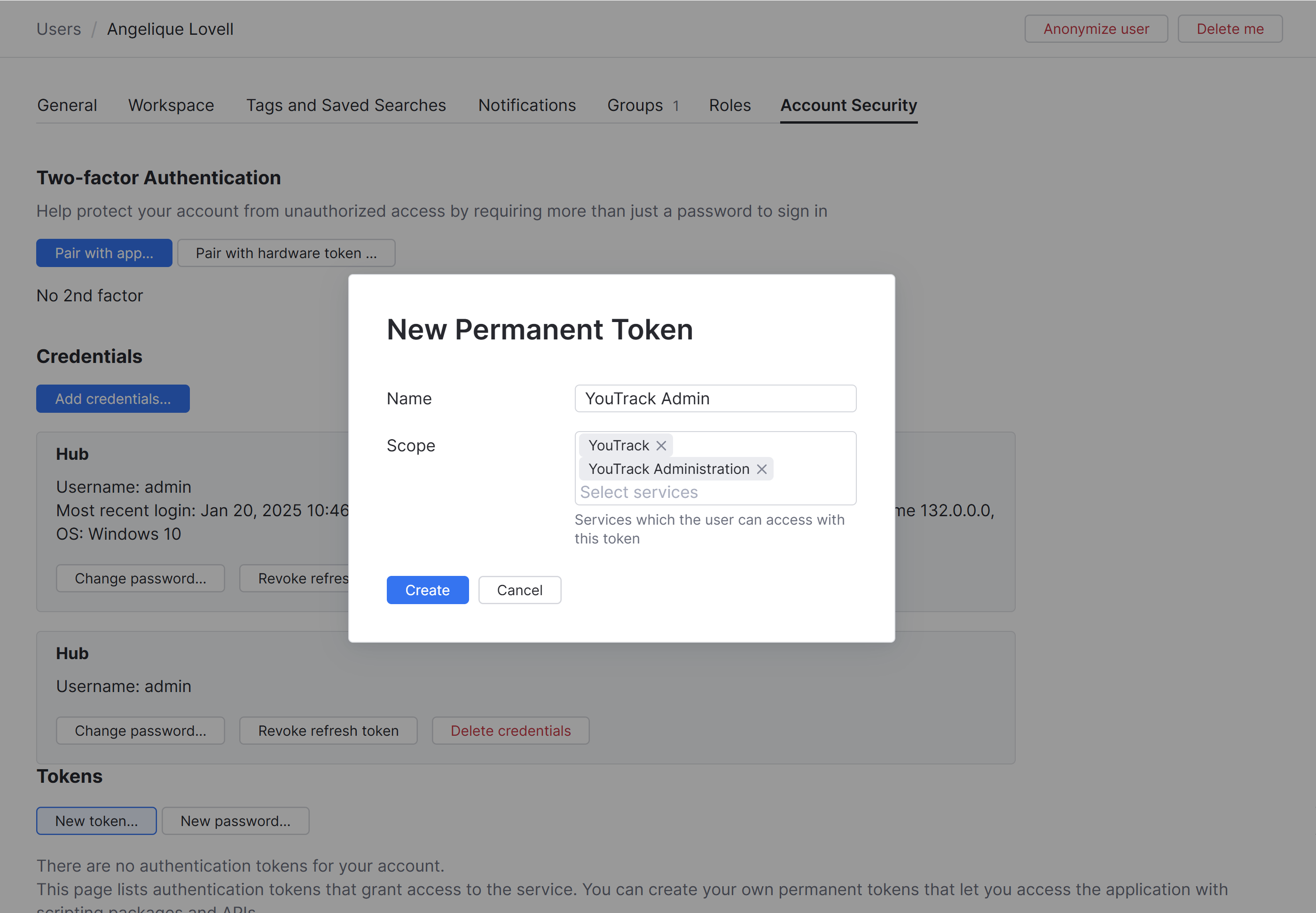 In the New Permanent Token dialog, specify a name for the new token and the access scope for it. The scope for the token is a list of services that you can access with this new token.