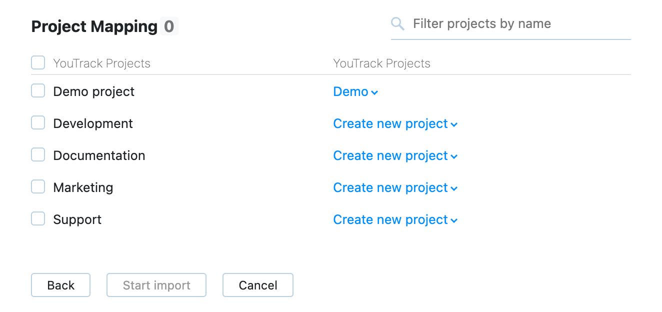 Select the projects that you want to import. Select the option at the top of the list to import all projects available in the source YouTrack.