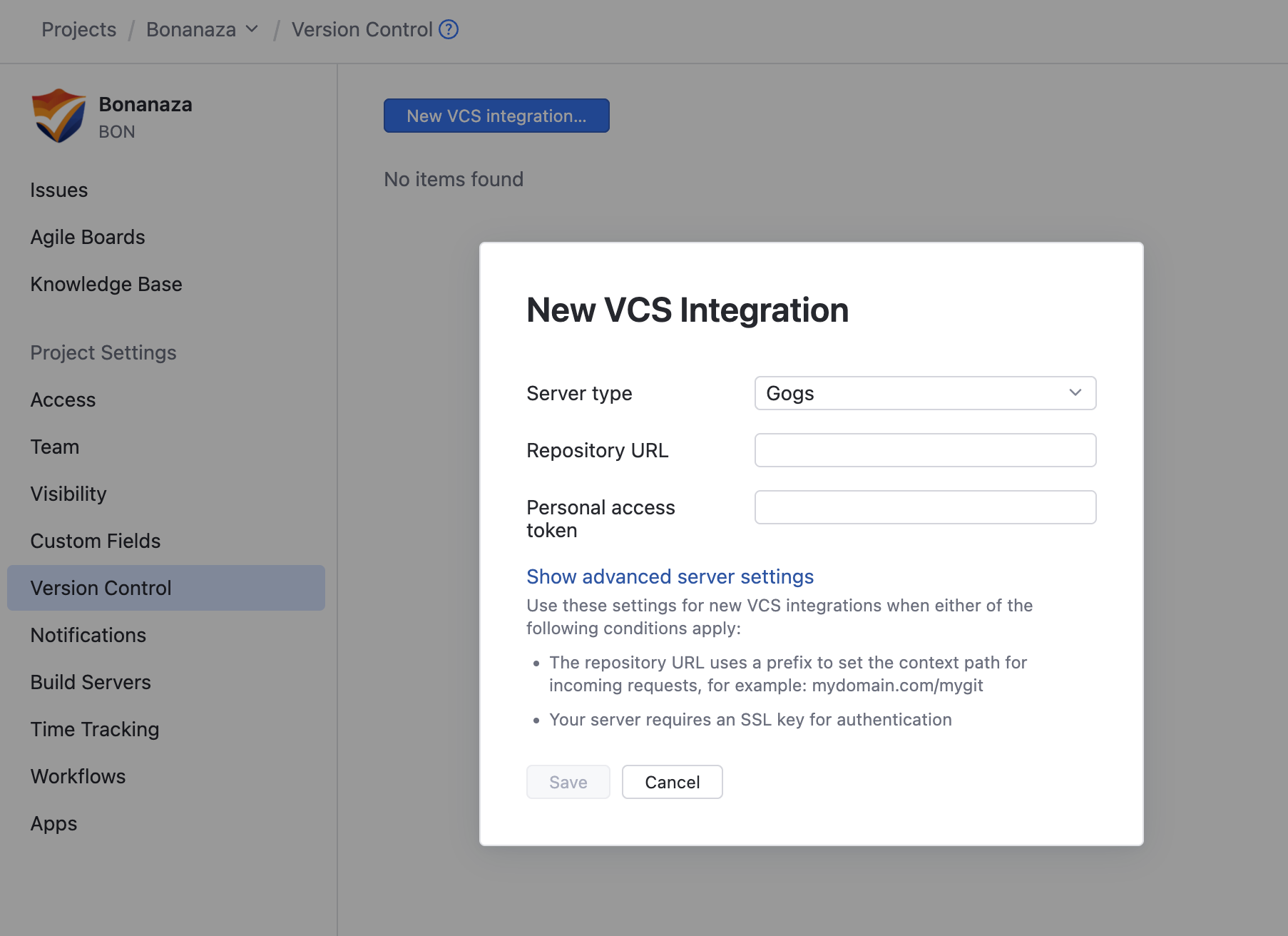 If you are unable to establish a connection to your repository using the basic settings on the New VCS Integration dialog, click the Show advanced server settings link.