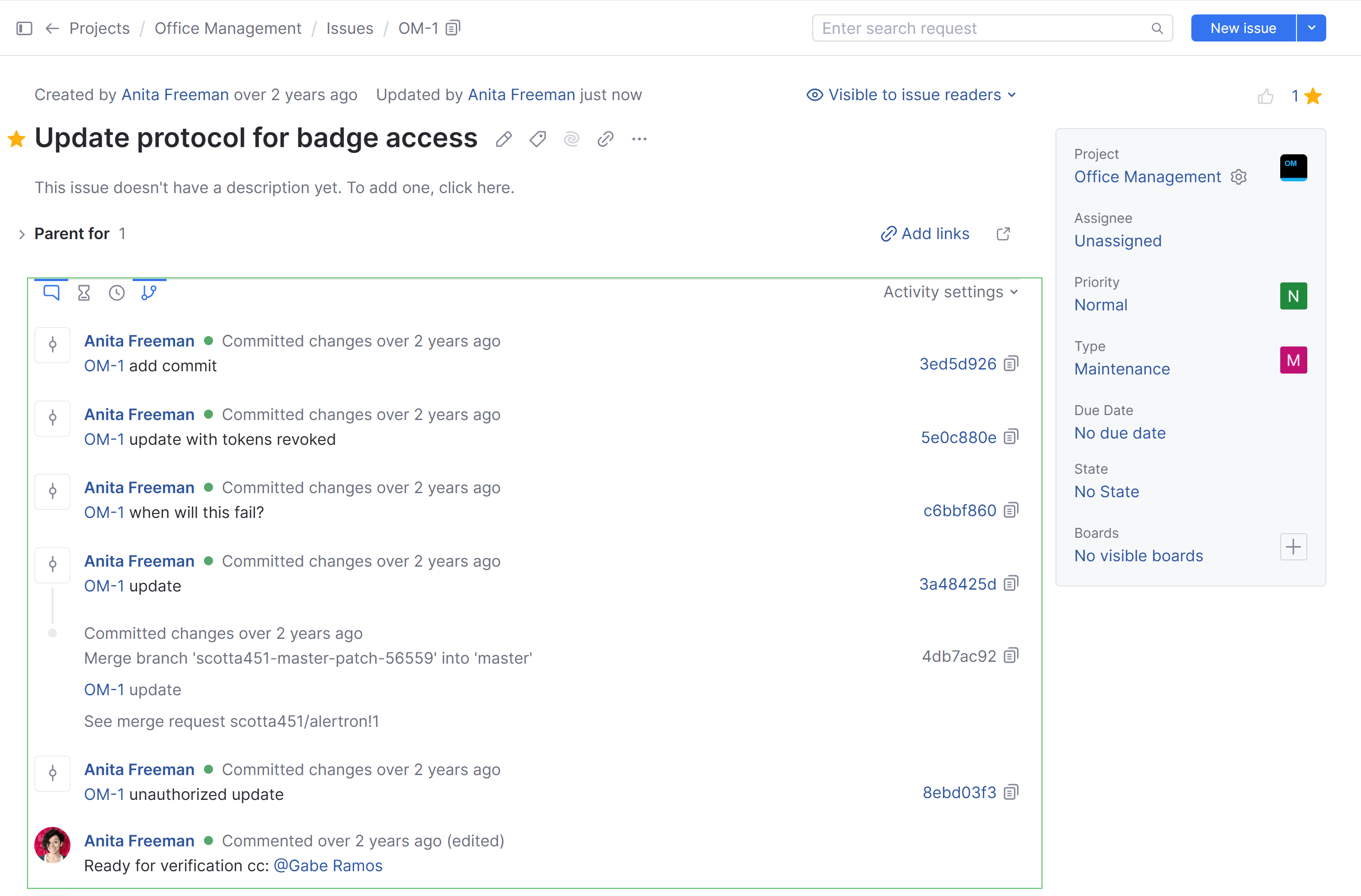 Here's an example of the activity stream filtered to show comments and VCS changes: