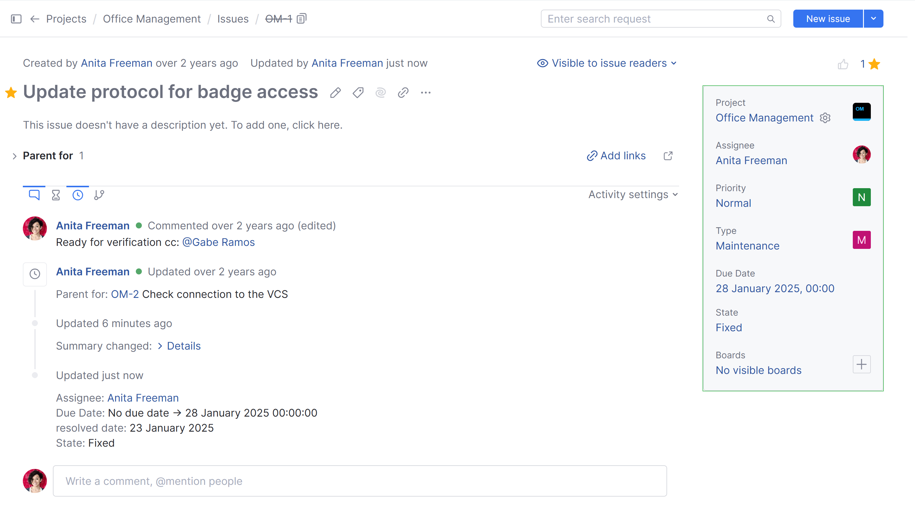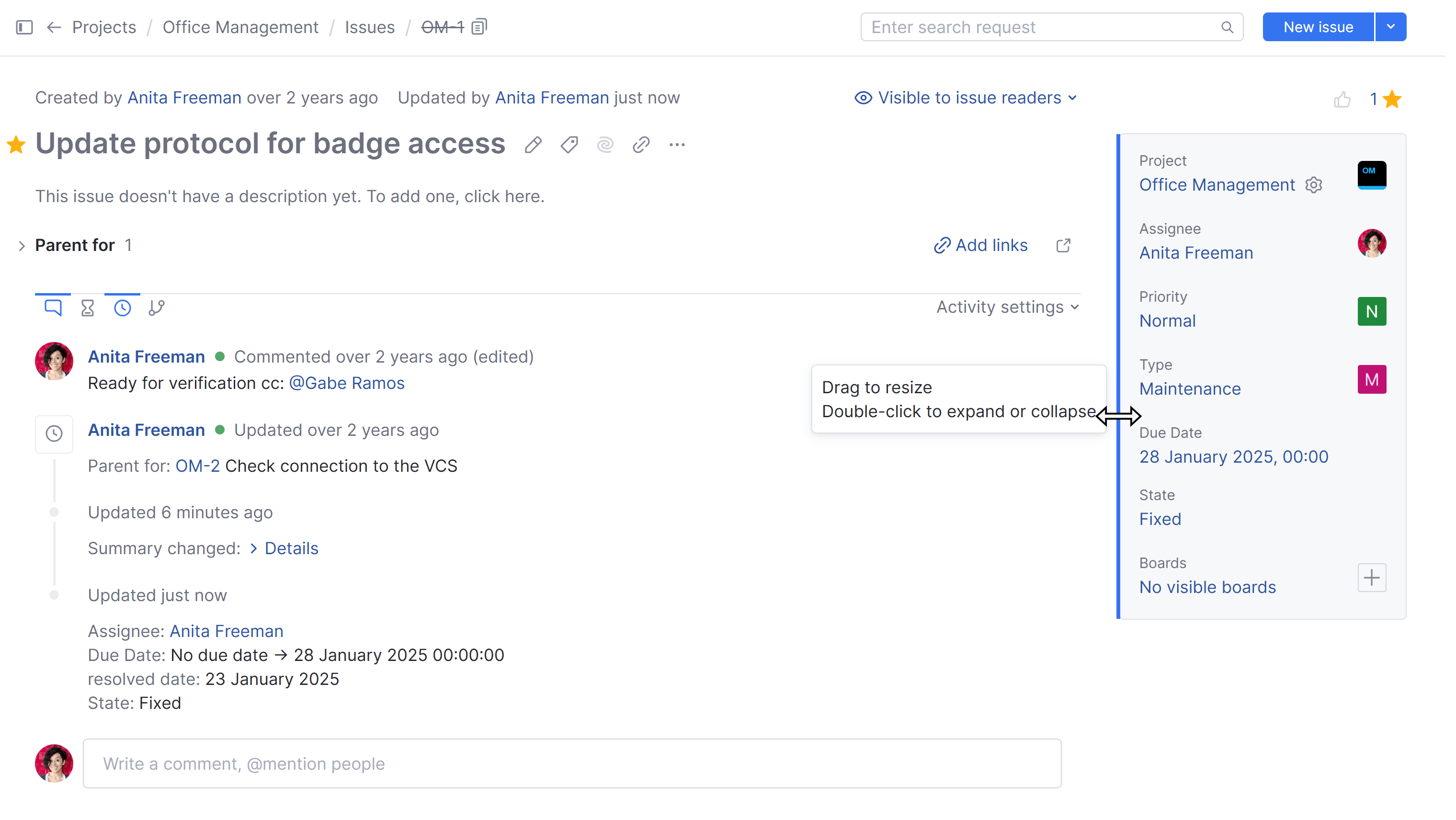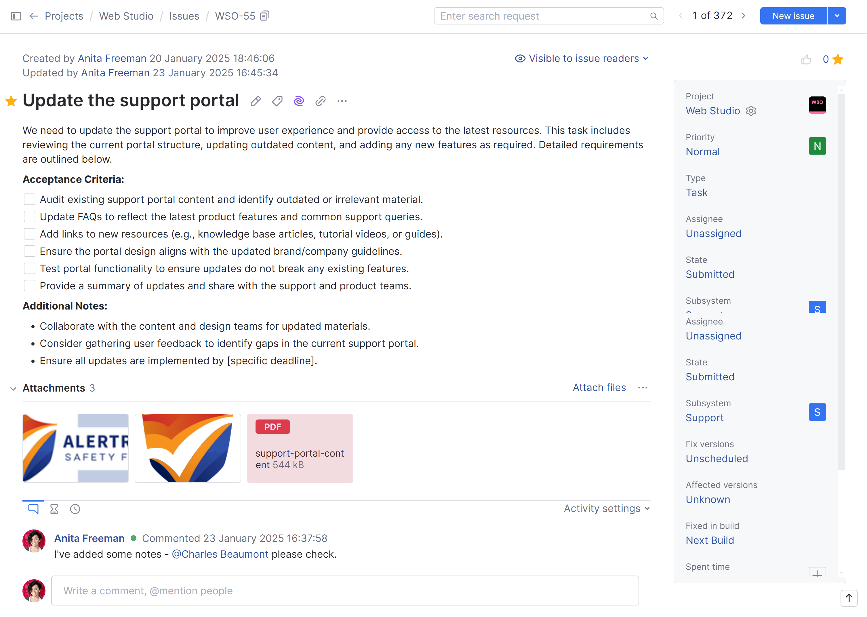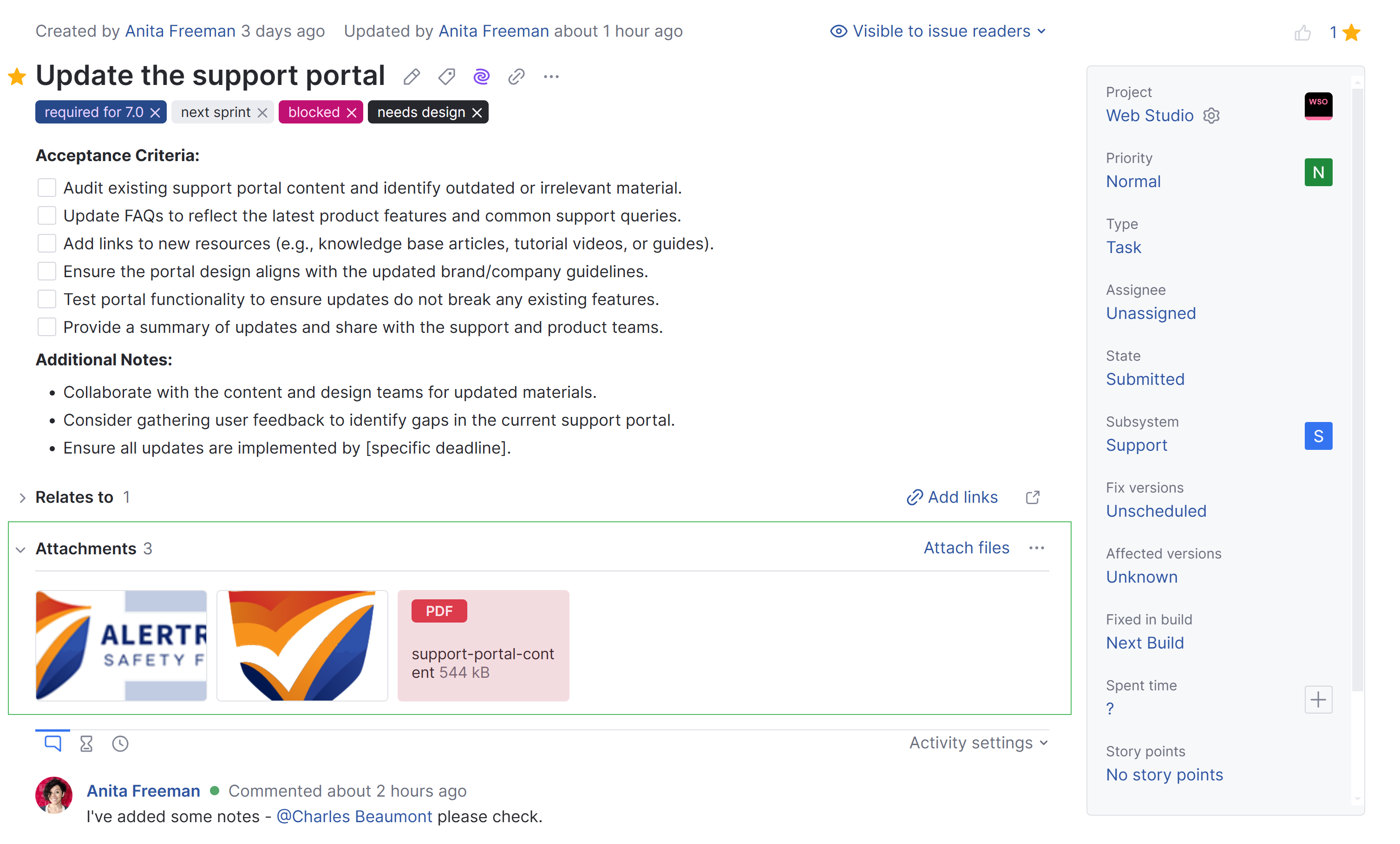 Updated by | Displays the full name of the user who last updated the issue. The date and time of the last update are also shown. Click the name to open the profile page for this user. |