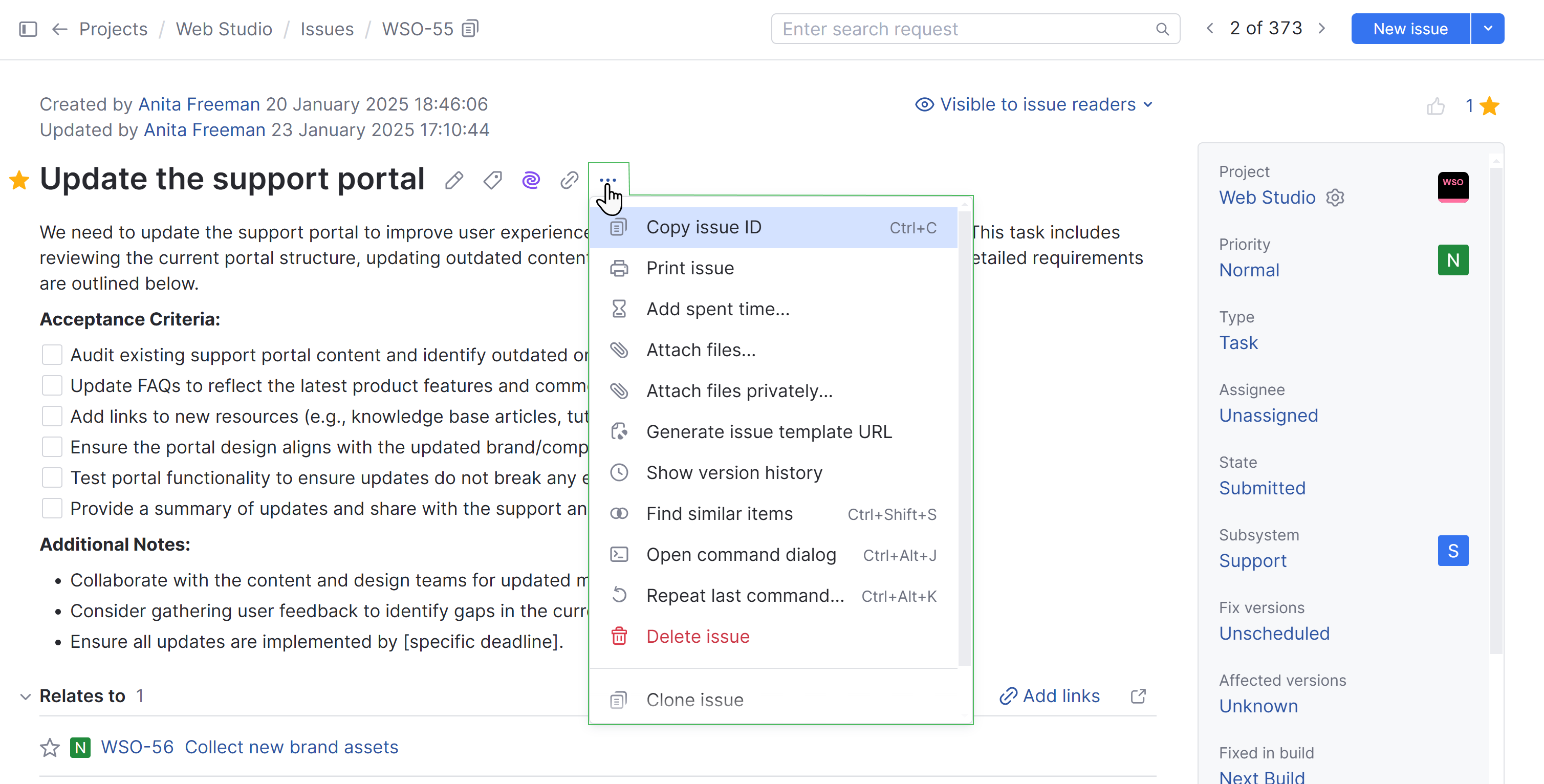 Clone issue | Creates a copy of the current issue. For more information, see Clone Issues. |