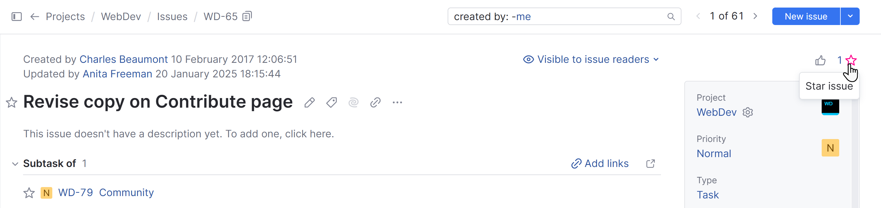 Star issue | This control lets you add the There's also a control just to the left of the issue summary that performs the same action. ![]() Click the icon a second time to stop watching (unstar) the issue. For more information, see Watch Issues. |