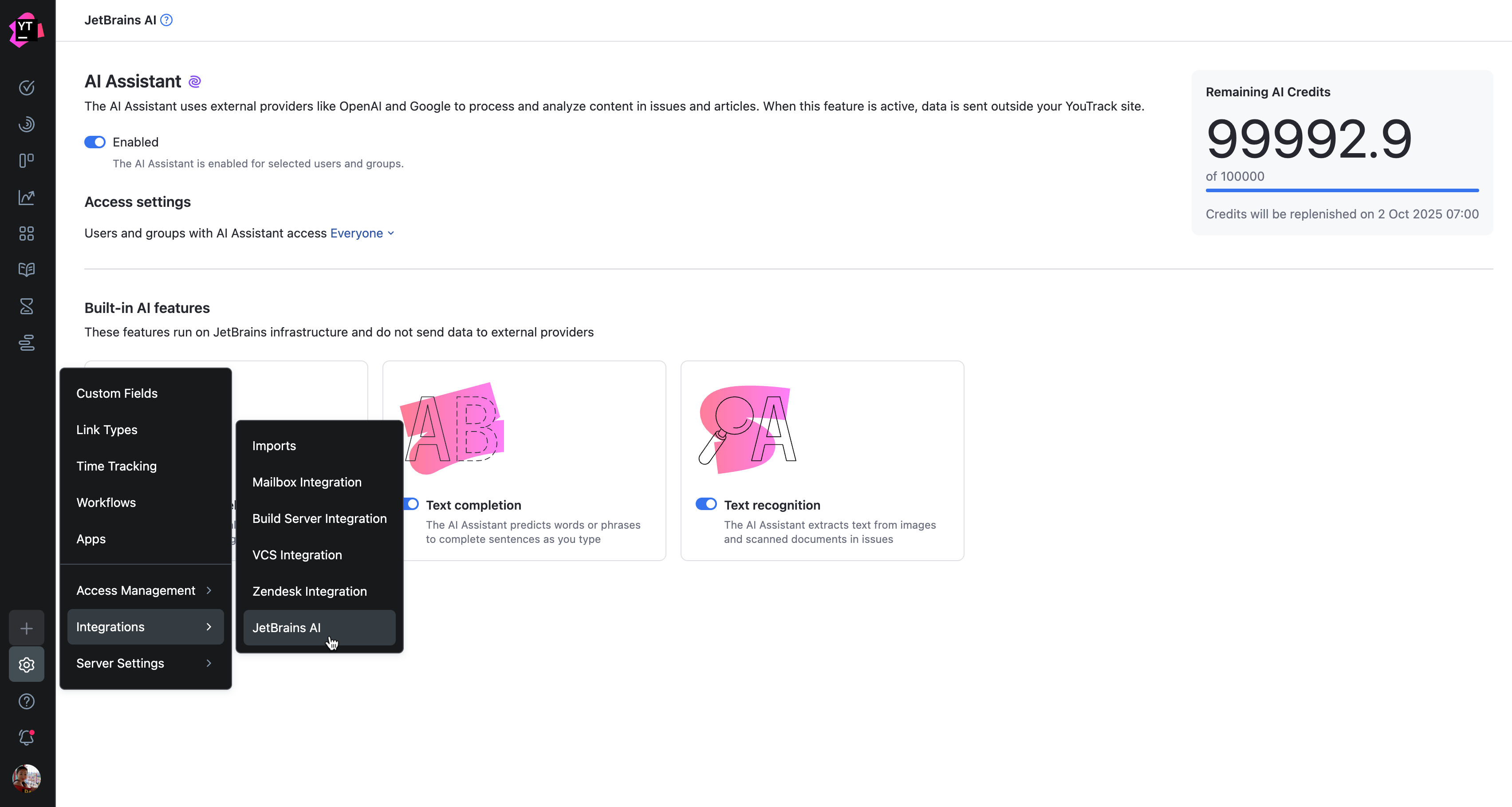 Your YouTrack site is allocated a fixed number of free credits for working with the JetBrains AI service. Each interaction with the AI Assistant in YouTrack consumes one credit. These credits are refreshed on a weekly basis.
