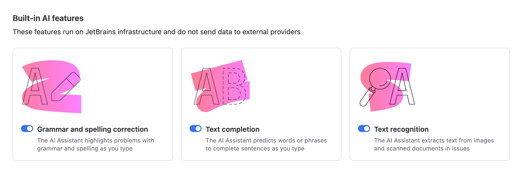 This setting controls whether users can access AI assistant features that rely on external providers, such as OpenAI and Google, to process and analyze content in issues and articles. These features are only available when the JetBrains AI service integration is enabled.