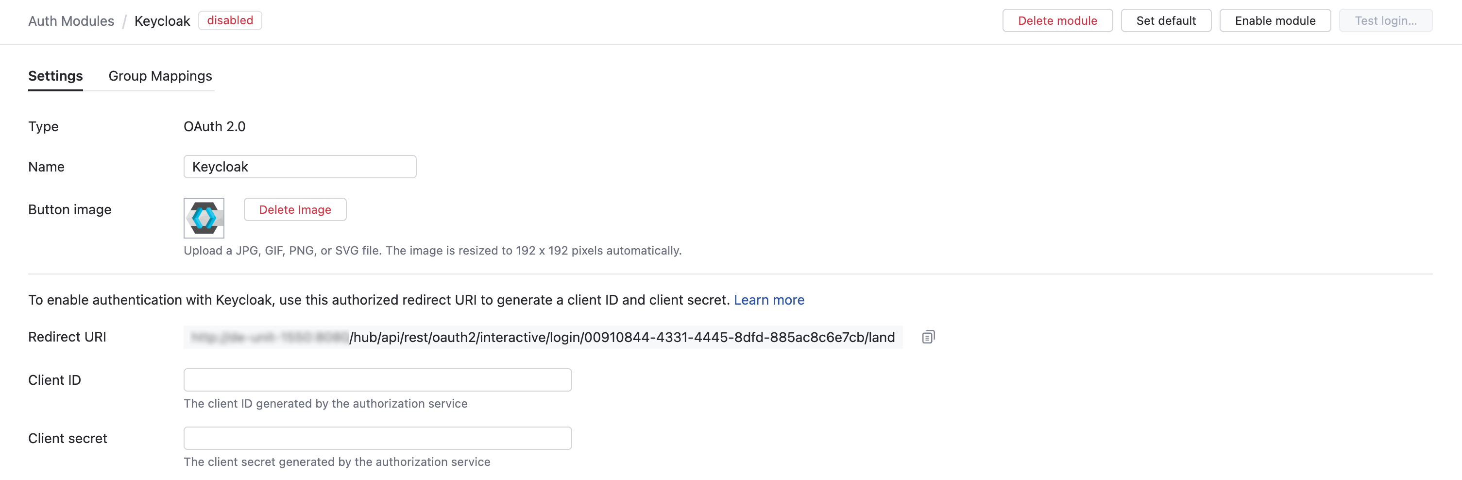 To complete the setup, store the client ID and secret from the authorization service in the Keycloak auth module.