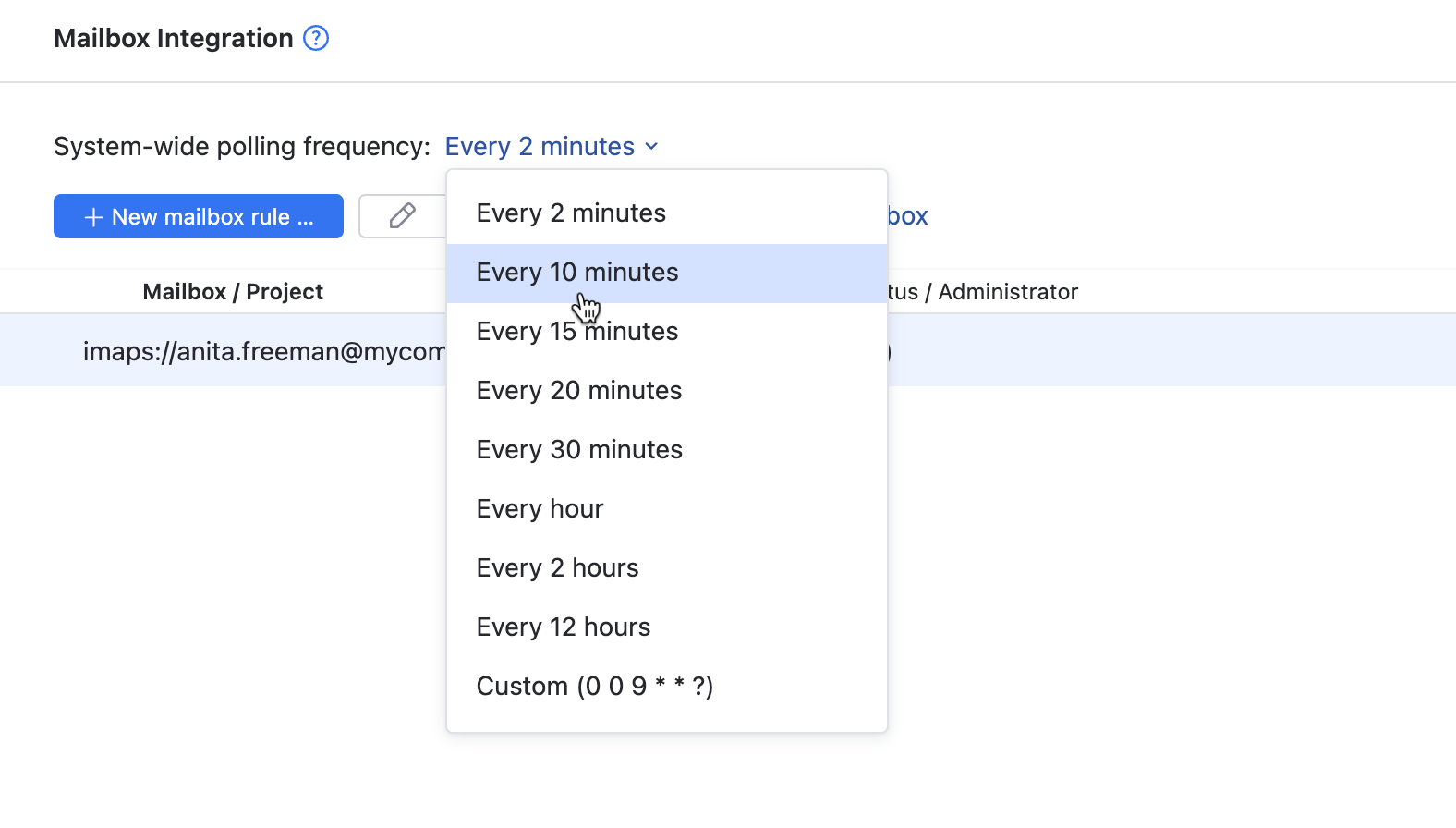 YouTrack retrieves email messages from the specified mail services according to a schedule. The default interval is every hour. You can change the schedule to a predefined interval or specify a custom interval with a cron expression. The schedule is not set independently for multiple mail services. The same schedule is applied to all mail services that are integrated with the YouTrack server.