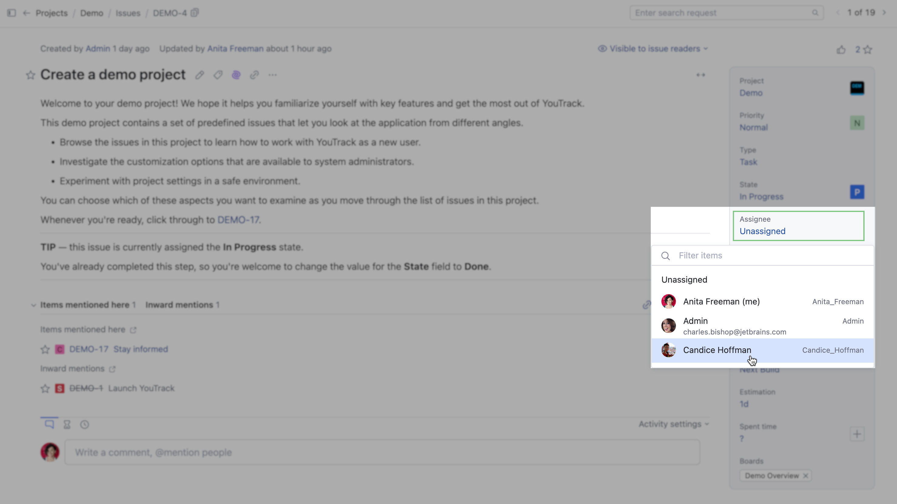 YouTrack immediately creates a new user that is assigned to the issue and project.