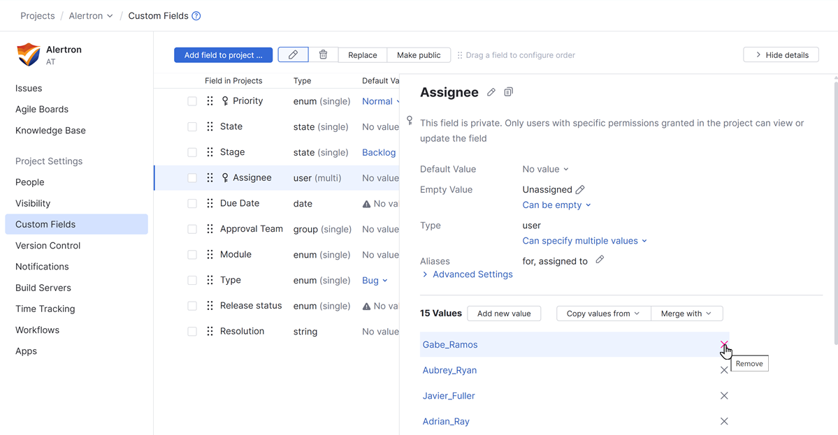 The following options are available when you select the Assignee field on the Custom Fields page of your project.