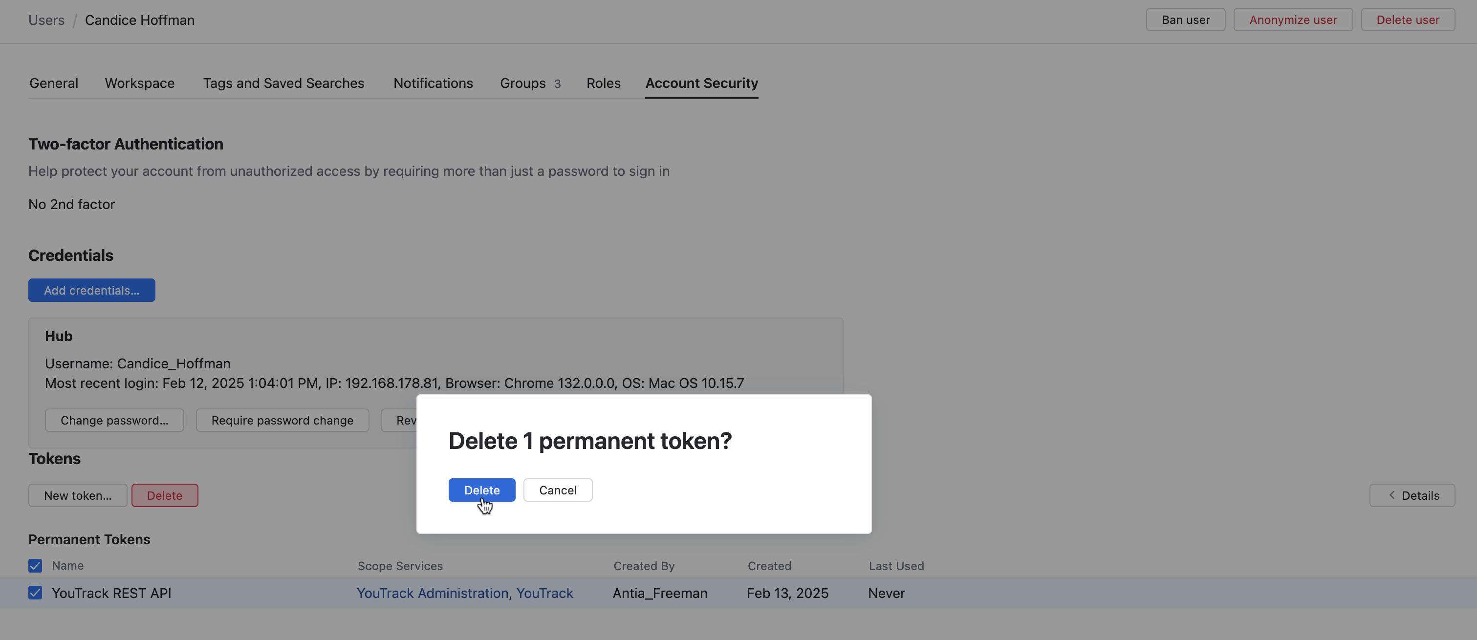 Select the user for whom you want to delete an authentication token.