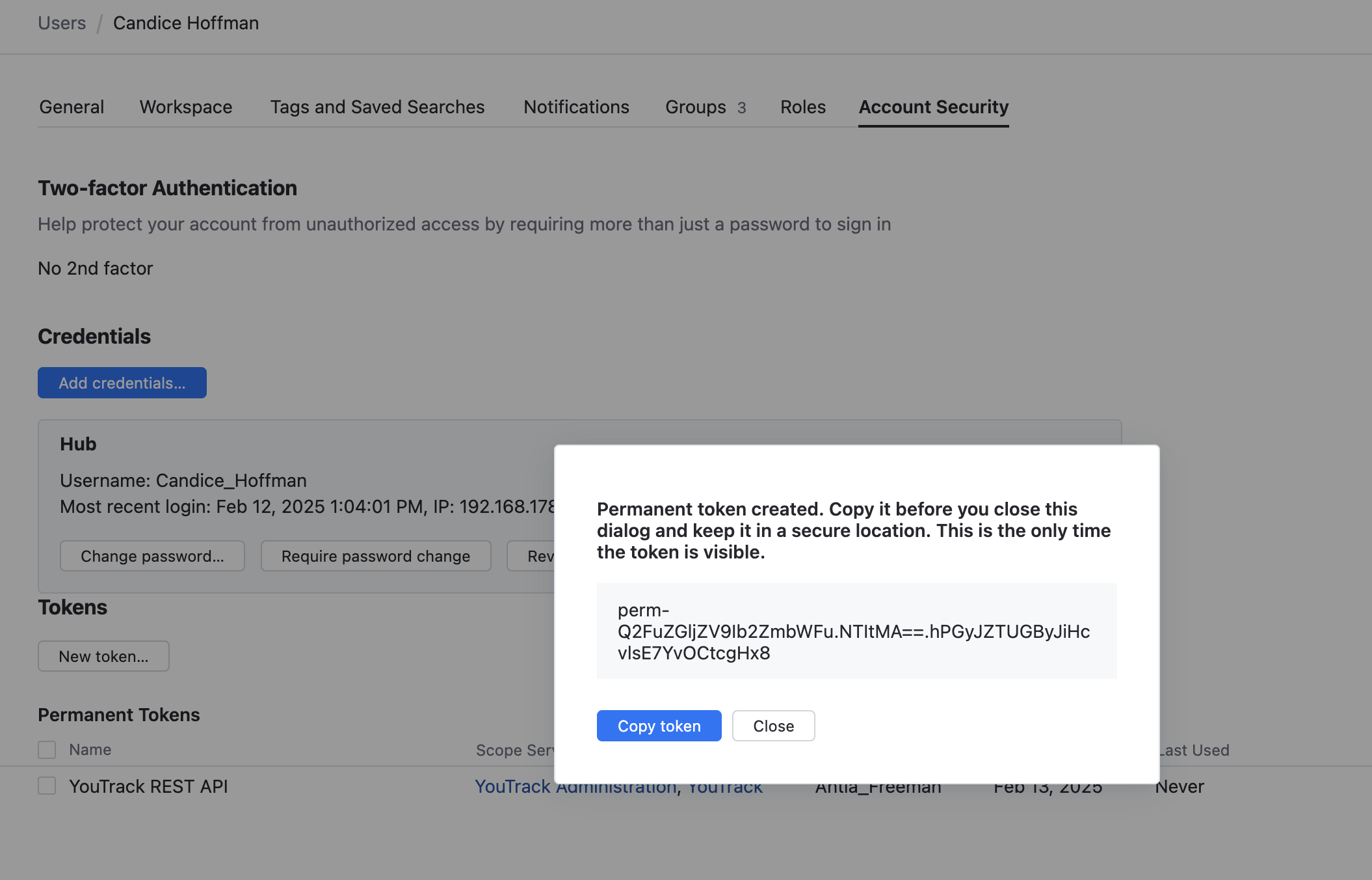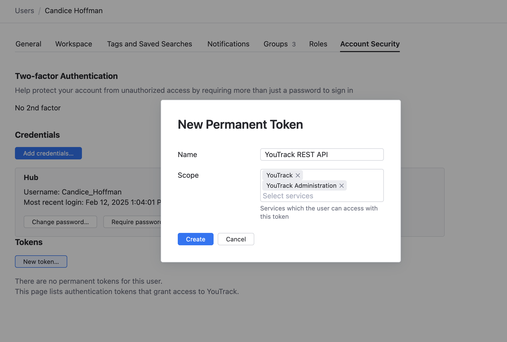 YouTrack lets users create a range of authentication tokens that they use in turn to log in to YouTrack through external client applications. These authentication variables are shown on the Account Security tab for each user in their Hub account.