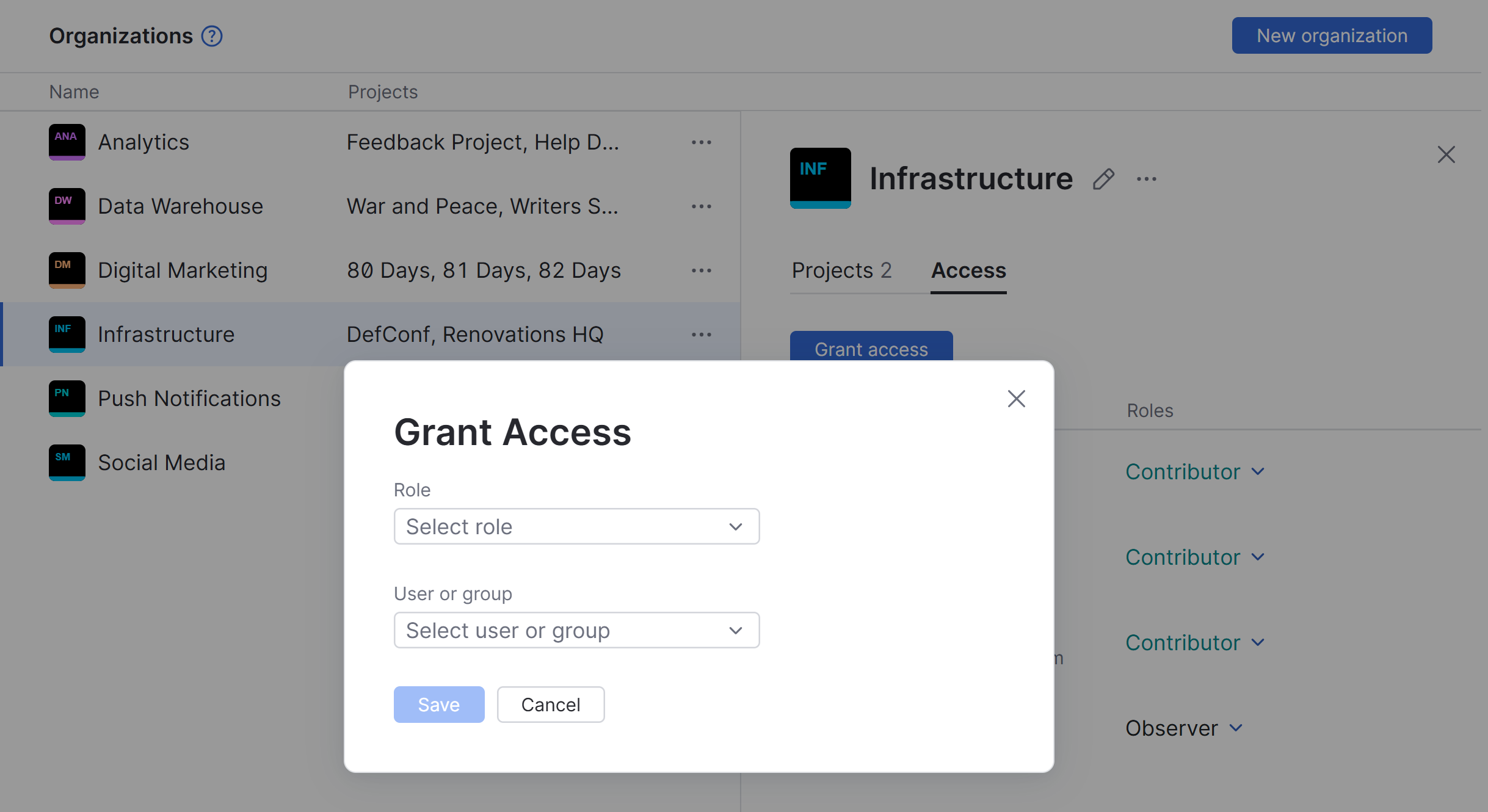 • The selected users and groups are granted access to all the projects that belong to the organization according to the permissions that are enabled for the selected role.