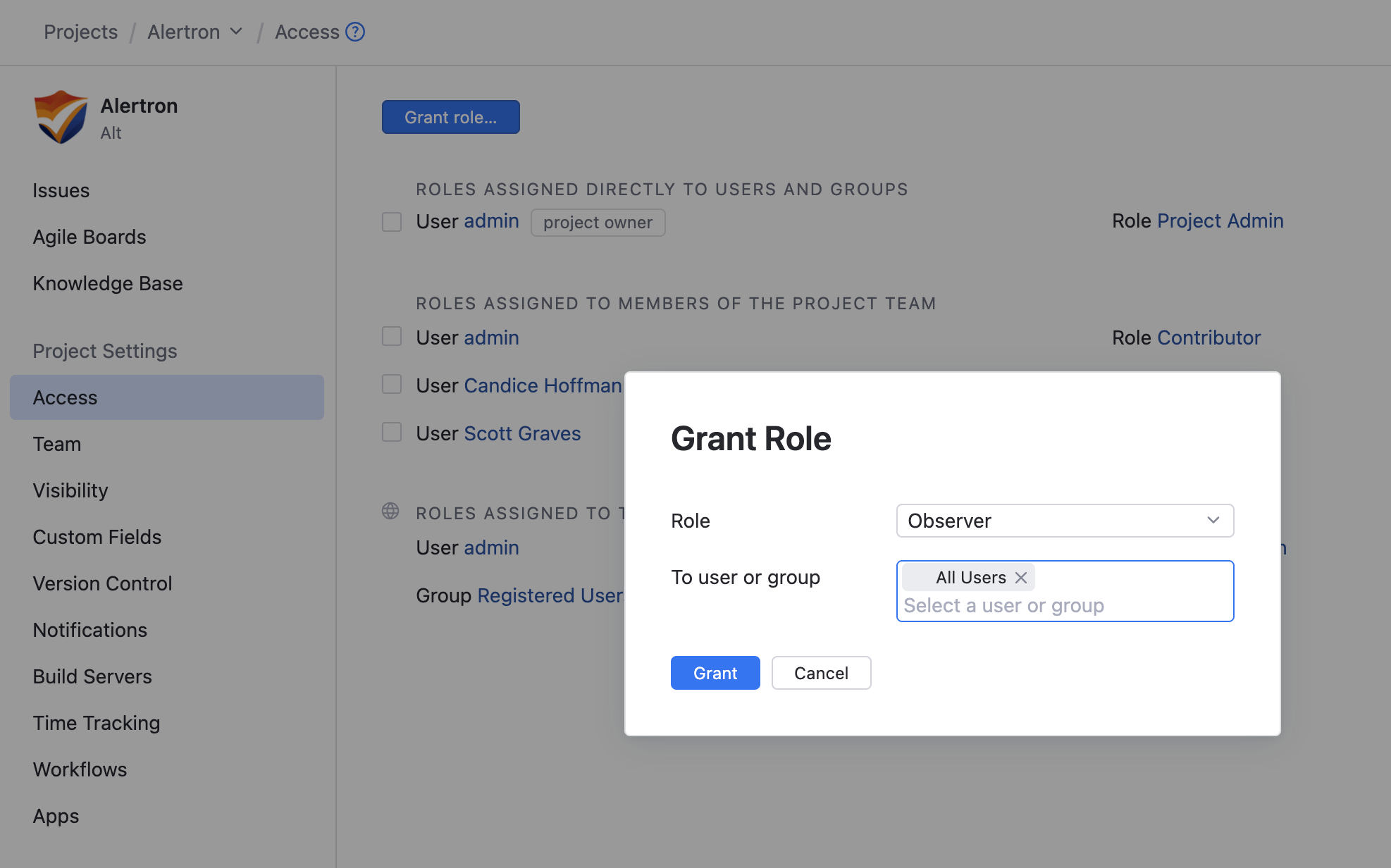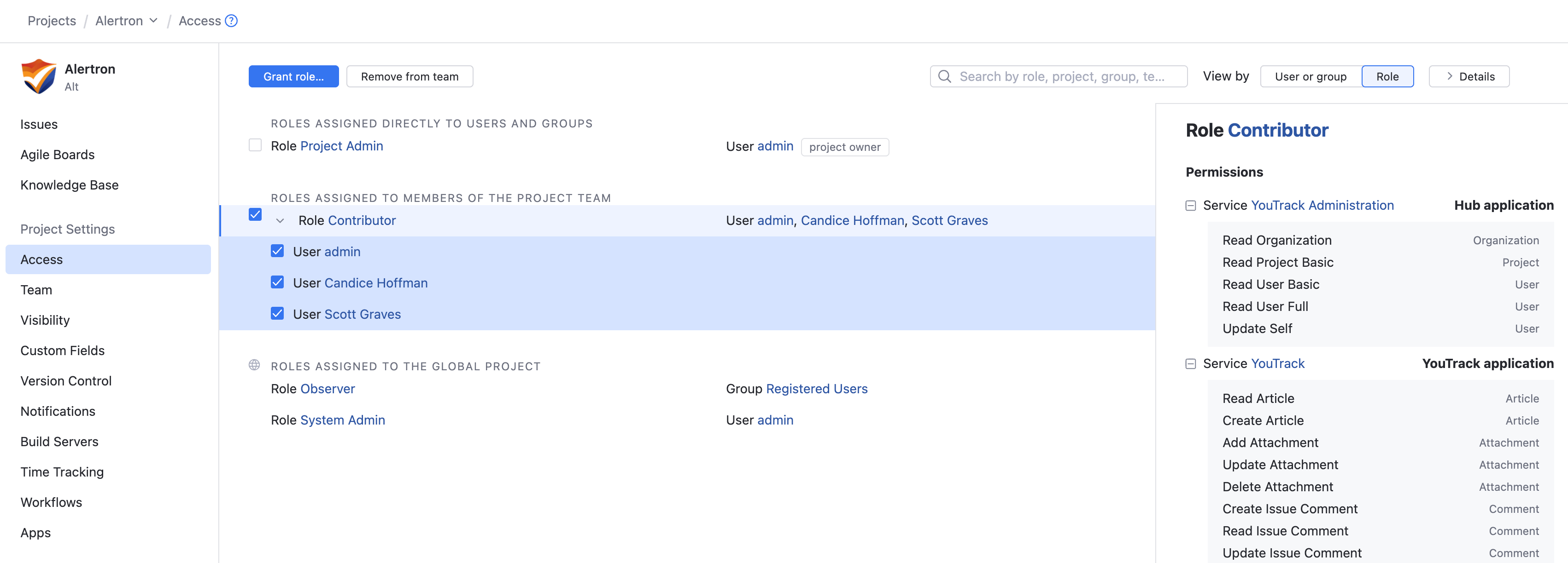 On the Access page in the Project Settings, you can see which roles are granted to users and groups in the project. This includes roles that are assigned to members of the project team as well as roles that are assigned to other users and groups directly. Use this information to determine how specific users are granted access to the project and view which actions they have permission to perform.