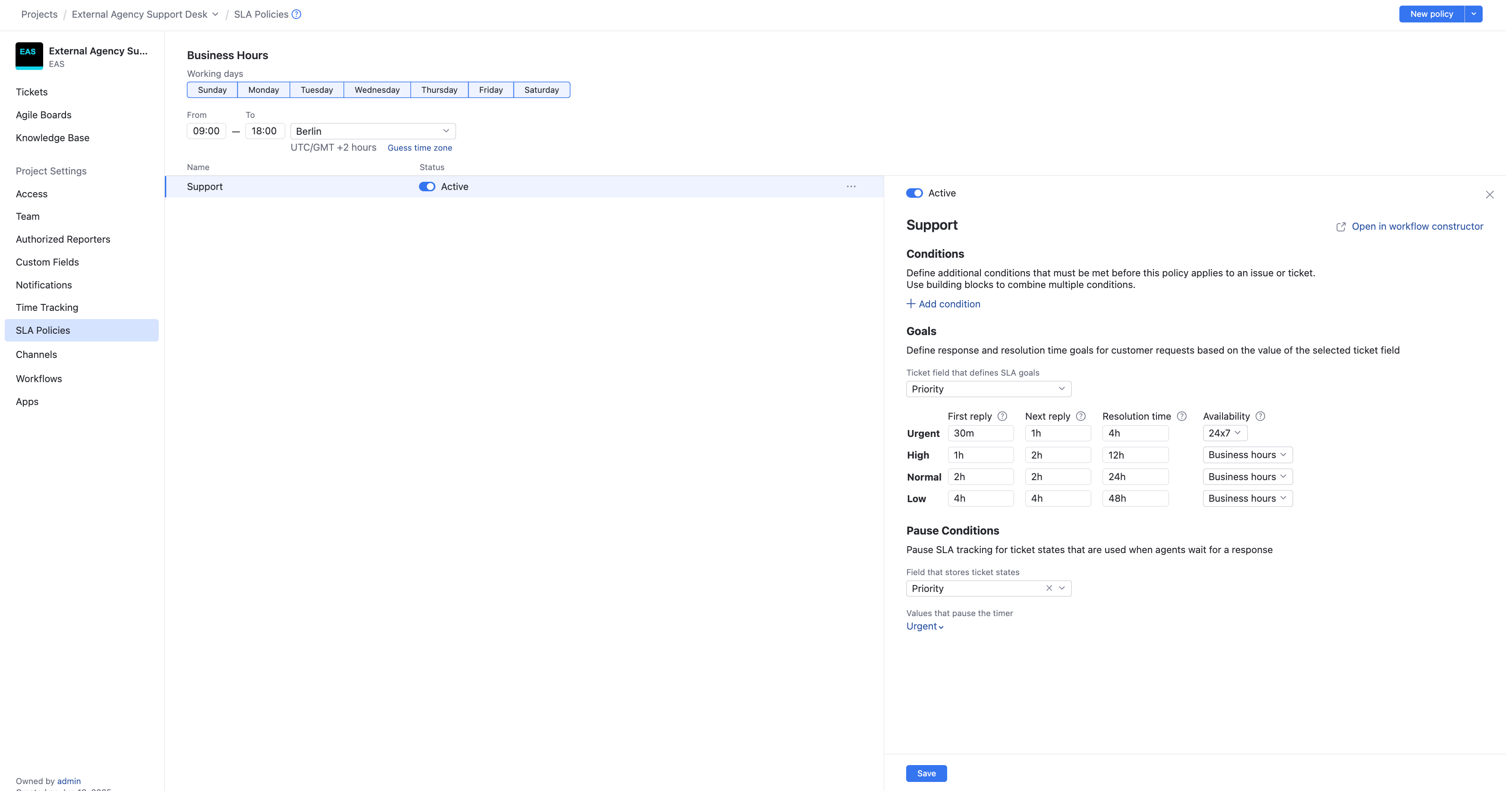 To learn how an SLA policy in YouTrack works, see SLA Policy in Action.