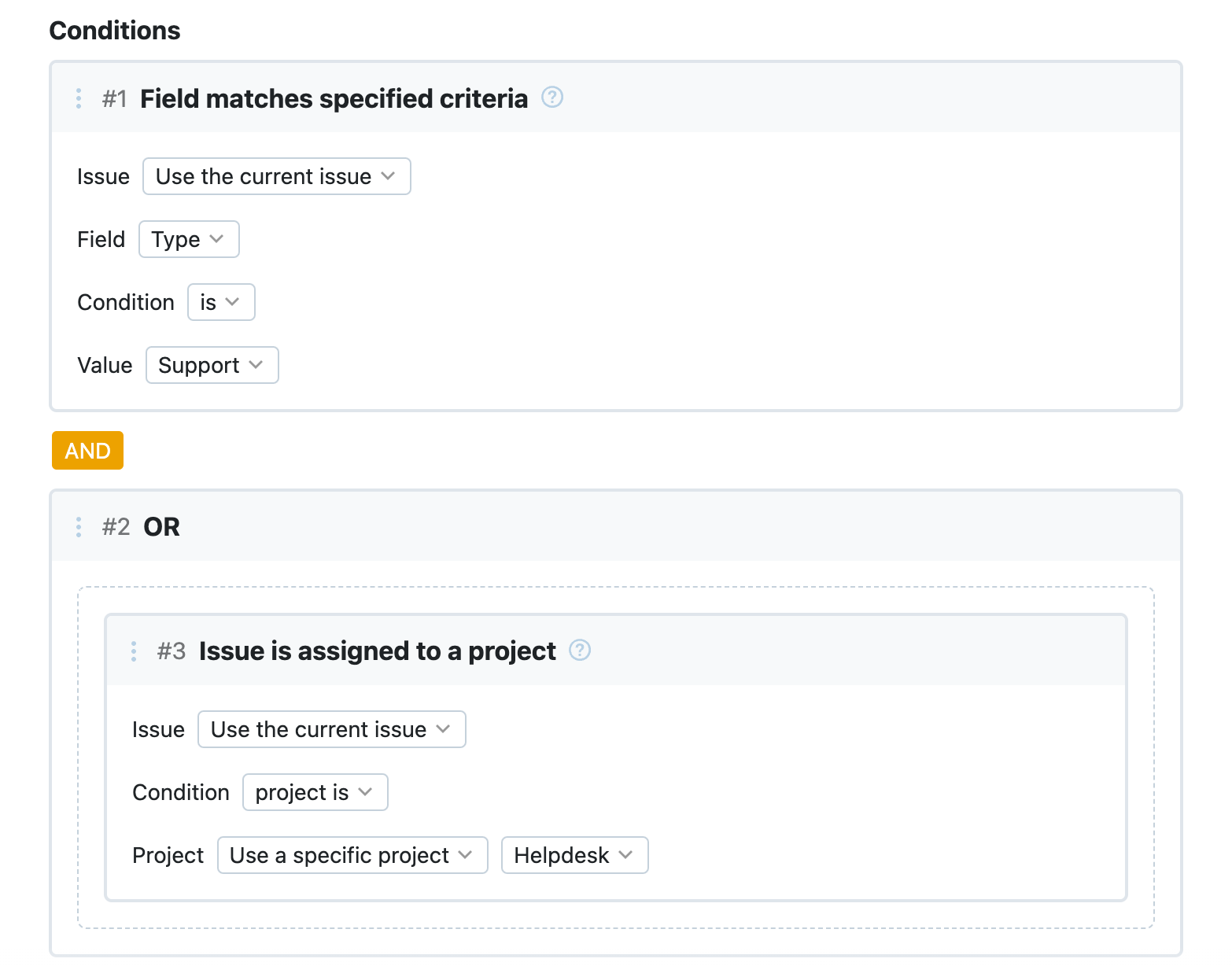 In the Conditions section of the settings, you can add one or more conditions and link them to one another using building blocks. Each block represents a condition that must be met before this SLA policy applies to a ticket.