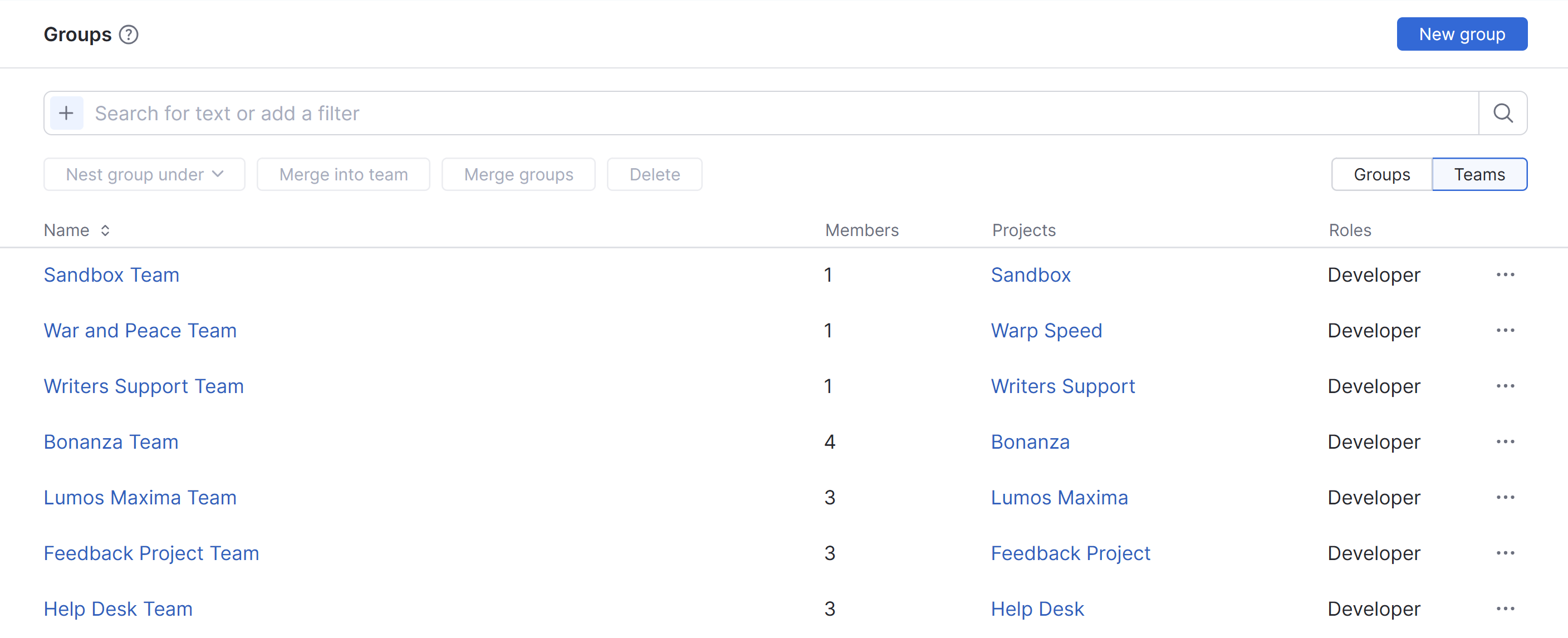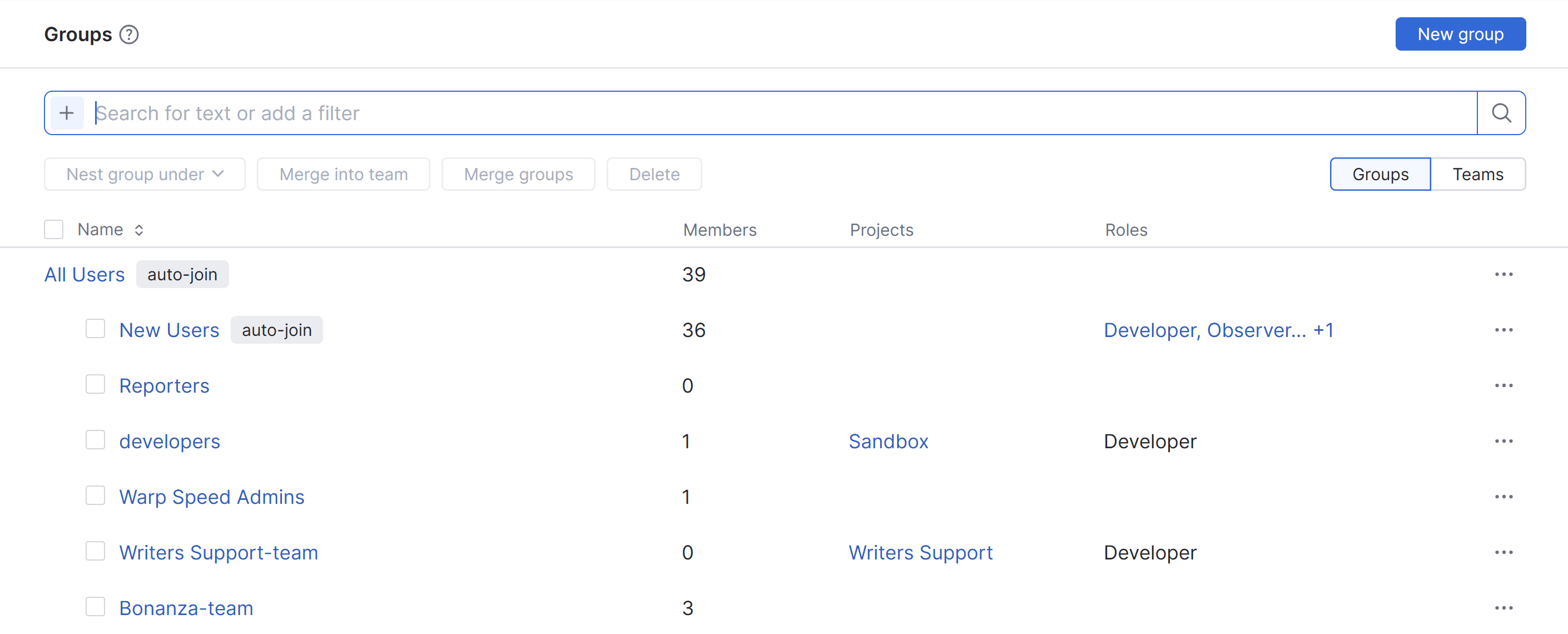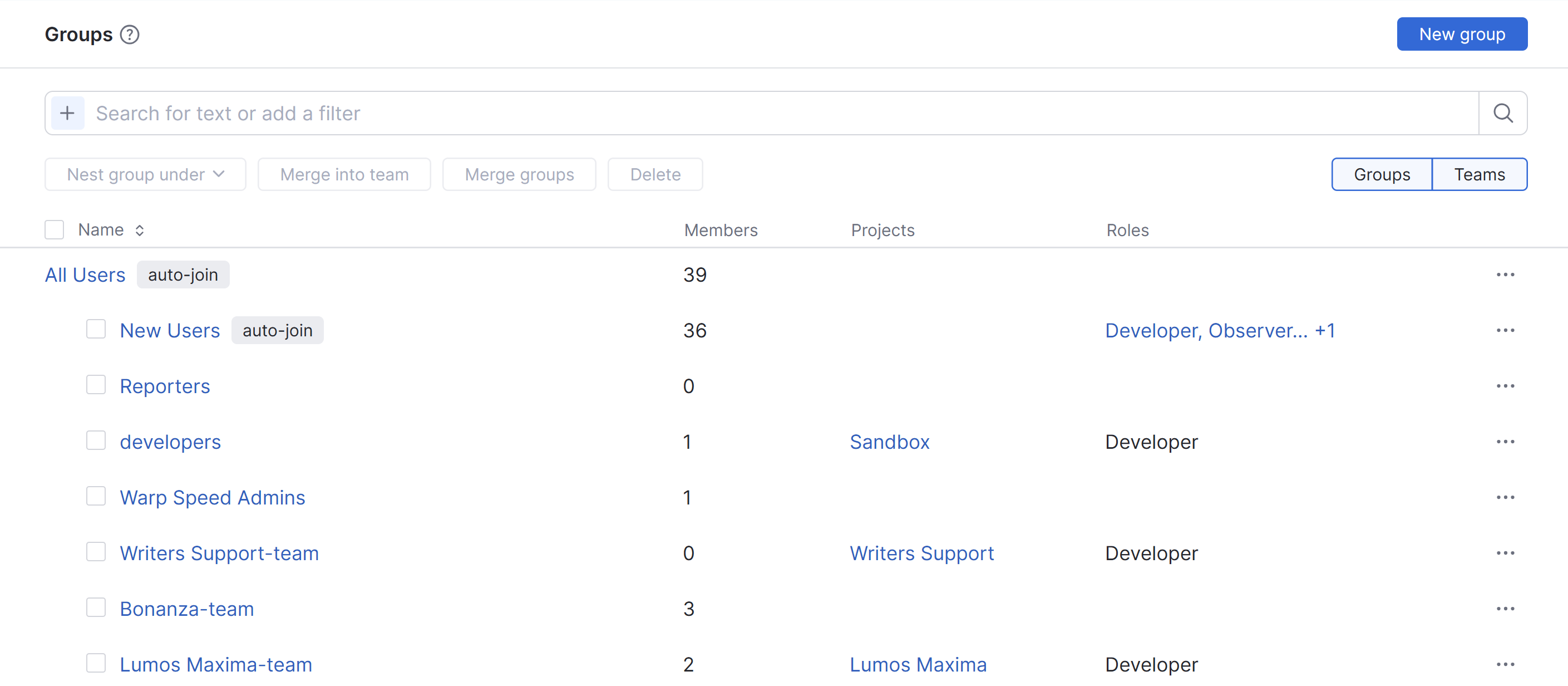 When the filters for Groups and Teams are both active, you have access to a mixed mode that shows both groups and project teams in a single list. In this view, project teams are shown with -team appended to the project name.