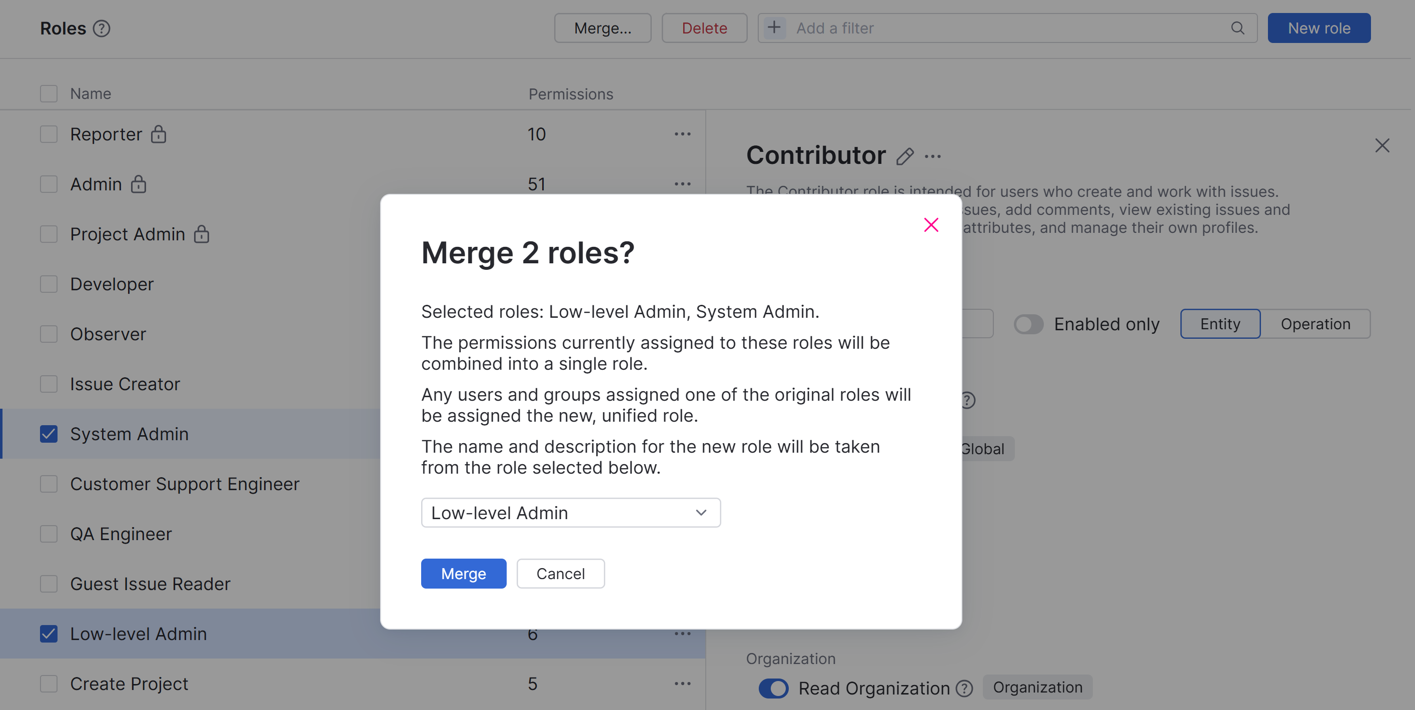 If you have multiple roles with overlapping permissions or want to simplify your access management scheme, you can merge two or more roles into a single target role.