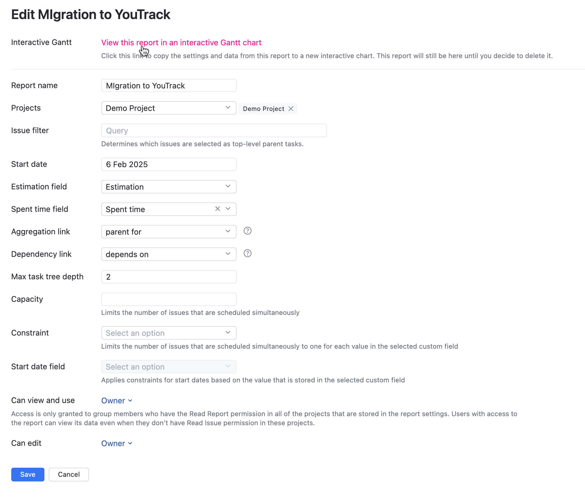 • If the banner is no longer visible, click the Edit to access the report settings. From here, click the View this report in an interactive Gantt chart link.