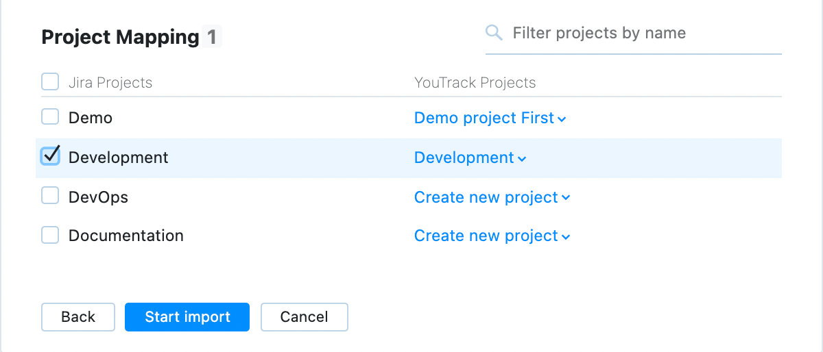 On the final step of the import setup, you have an option to select those Jira projects that you want to import to YouTrack. You can also choose whether to create a new project for the import or import data into an existing project in YouTrack.