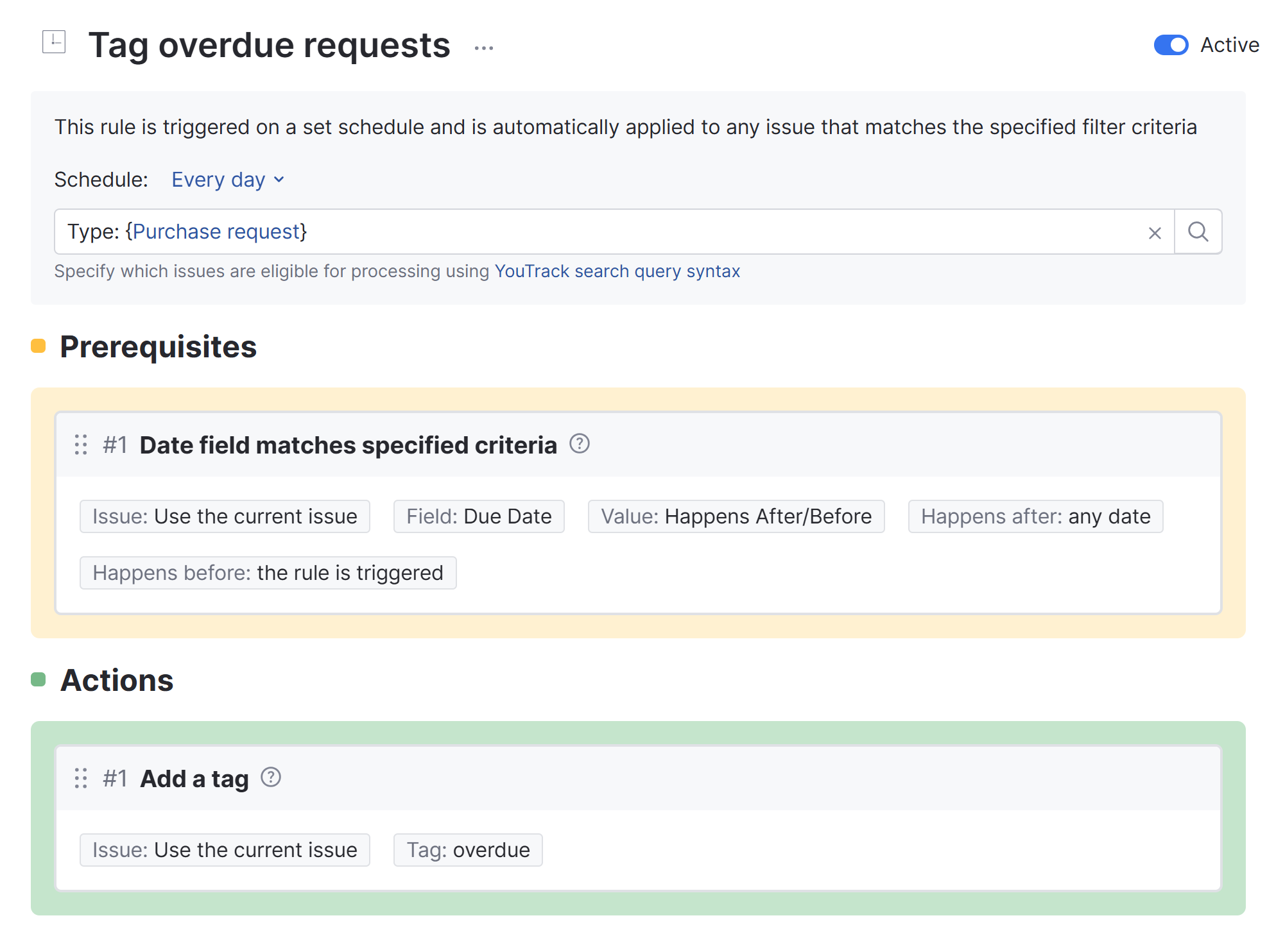 Schedule | The Every day option runs the rule once a day at midnight according to the time zone that is configured for the YouTrack instance. |
