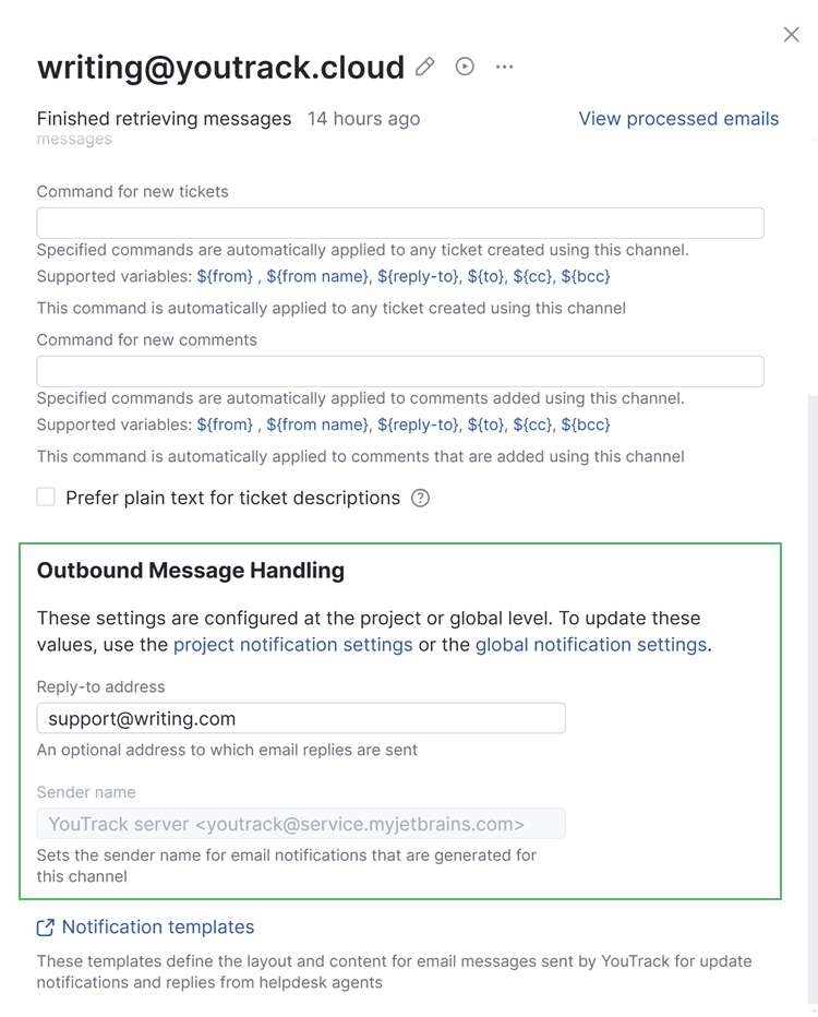 To update this value, open the Notifications settings in your helpdesk project. To learn more, see Manage Project Notification Settings. |