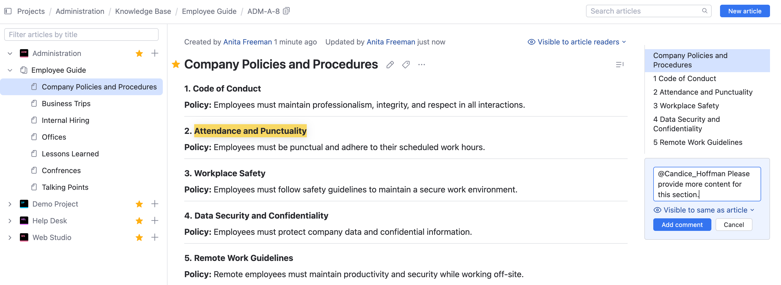 With inline comments, you can engage in discussions and provide feedback on specific parts of the article. Users who have access to the article can read the inline comment and respond to it by adding their own comments, leading to a threaded discussion. Once the discussion has reached a conclusion, the comment can be marked as Resolved.