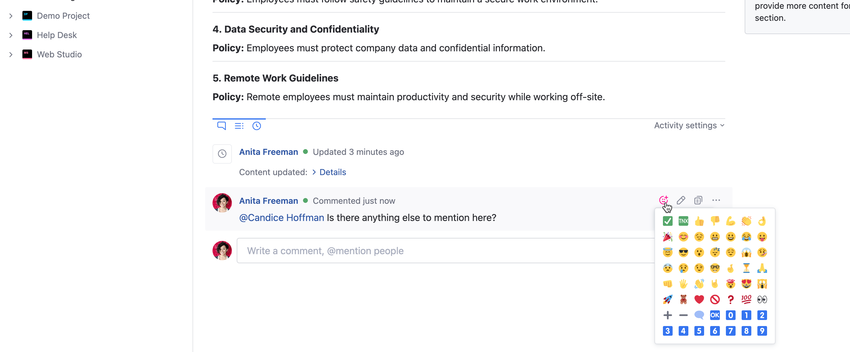 Comments let you and other members of your team engage with the author and discuss the content on the page. You can use comments to ask and answer questions and provide supplemental information.