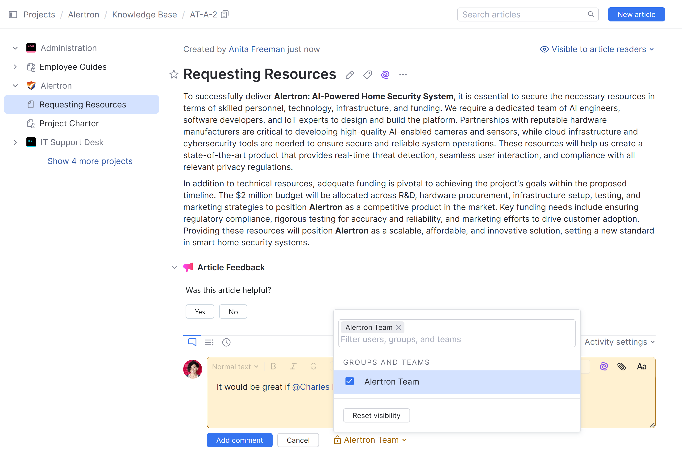 You can restrict the visibility of a comment to a subset of the users for whom the article is visible. For example, if the article is visible to article readers, you can restrict the visibility of a comment to group A or any other users who have permission to read articles in the project. To learn more about the visibility options for articles, see Manage Article Access.