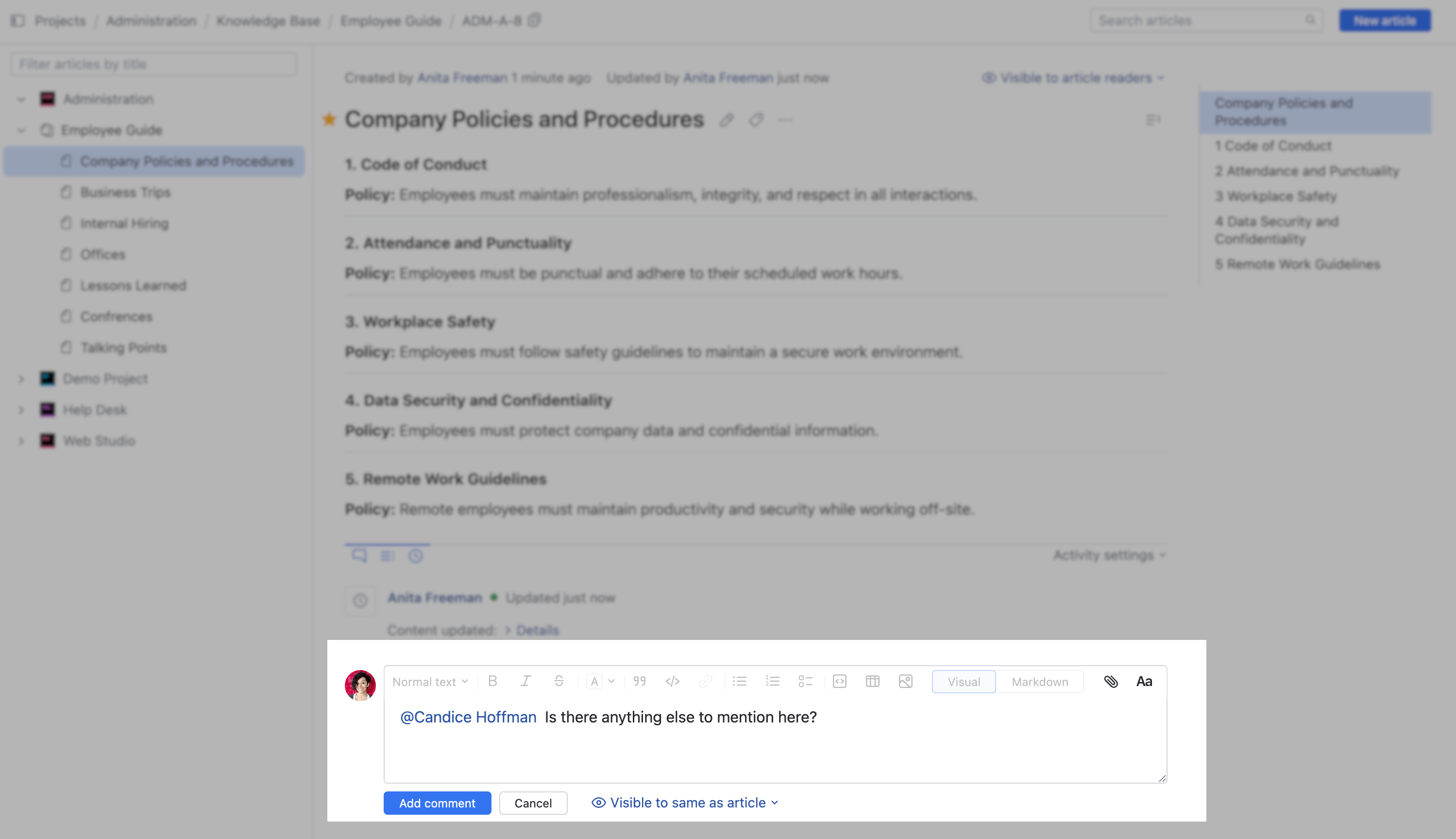 The knowledge base is a space for exchanging information and sharing ideas. One of the key components that create this sense of conversation is the comments section.