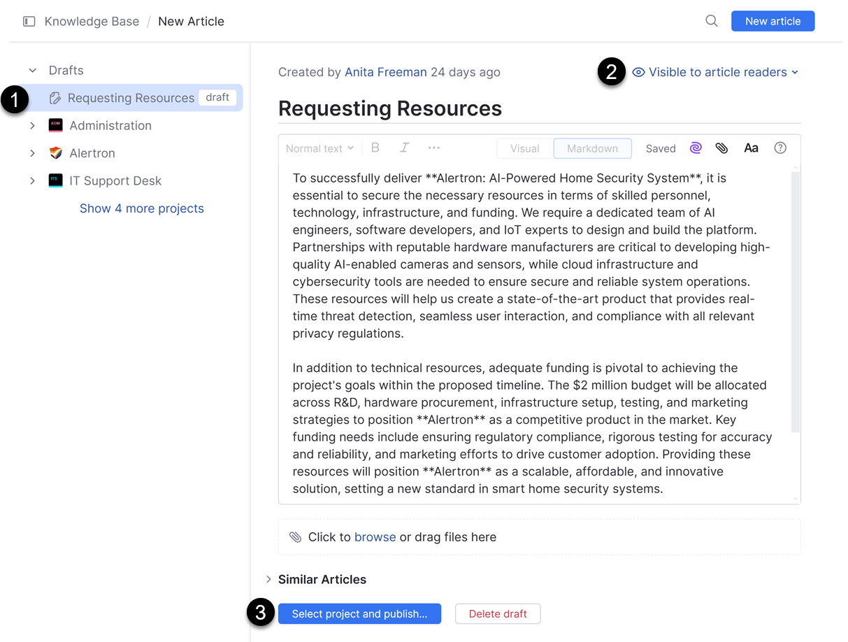 When you are ready to share an article with your target audience, you can publish it to the knowledge base.