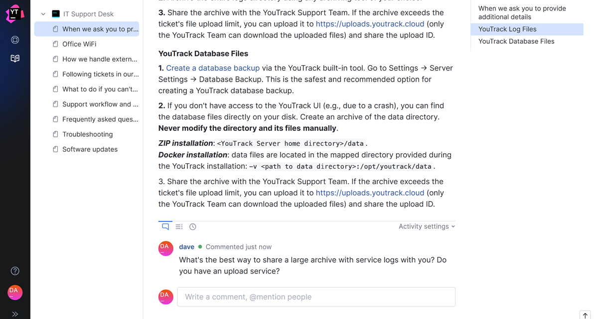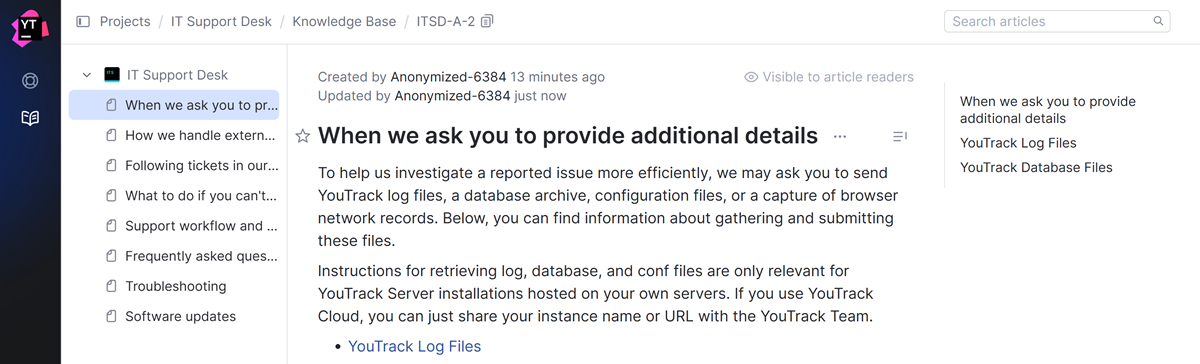 When you open a ticket in YouTrack, you also get access to the public articles in the knowledge base that the service provider has made available.