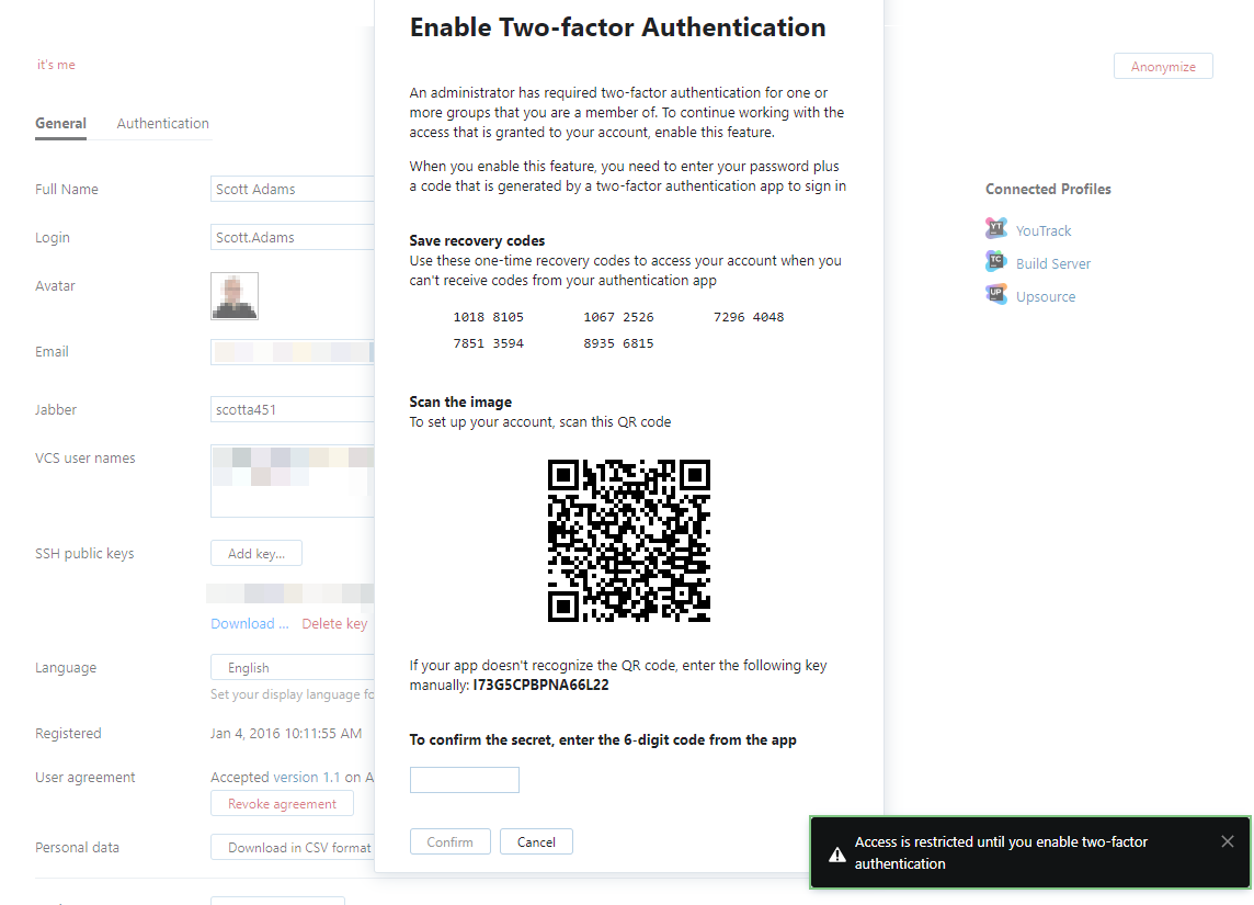 When you enable this feature for a group in YouTrack, all of its members are immediately required to set up 2FA for their Hub accounts. Members of the group who have not already enabled 2FA for their Hub accounts are prompted to do so the next time they log in. Users can dismiss the notification and cancel 2FA setup. However, their access to YouTrack will be severely restricted. To remove this restriction and resume working with the permissions that are available to their accounts, they must add a second authentication factor to their accounts.