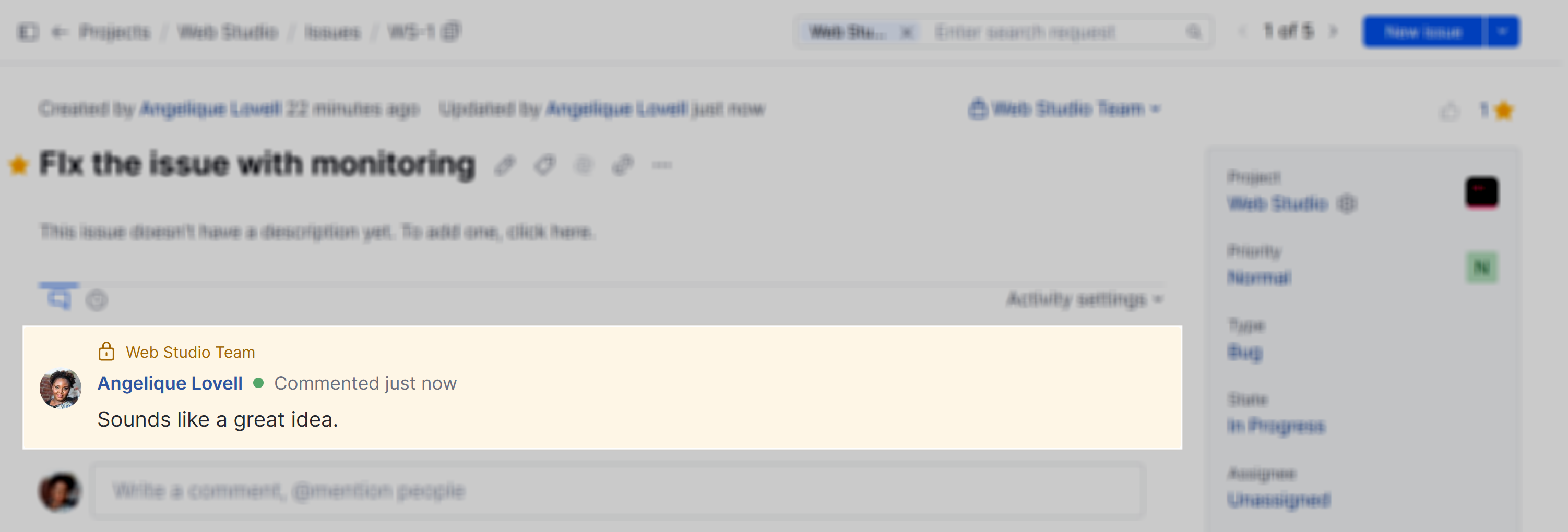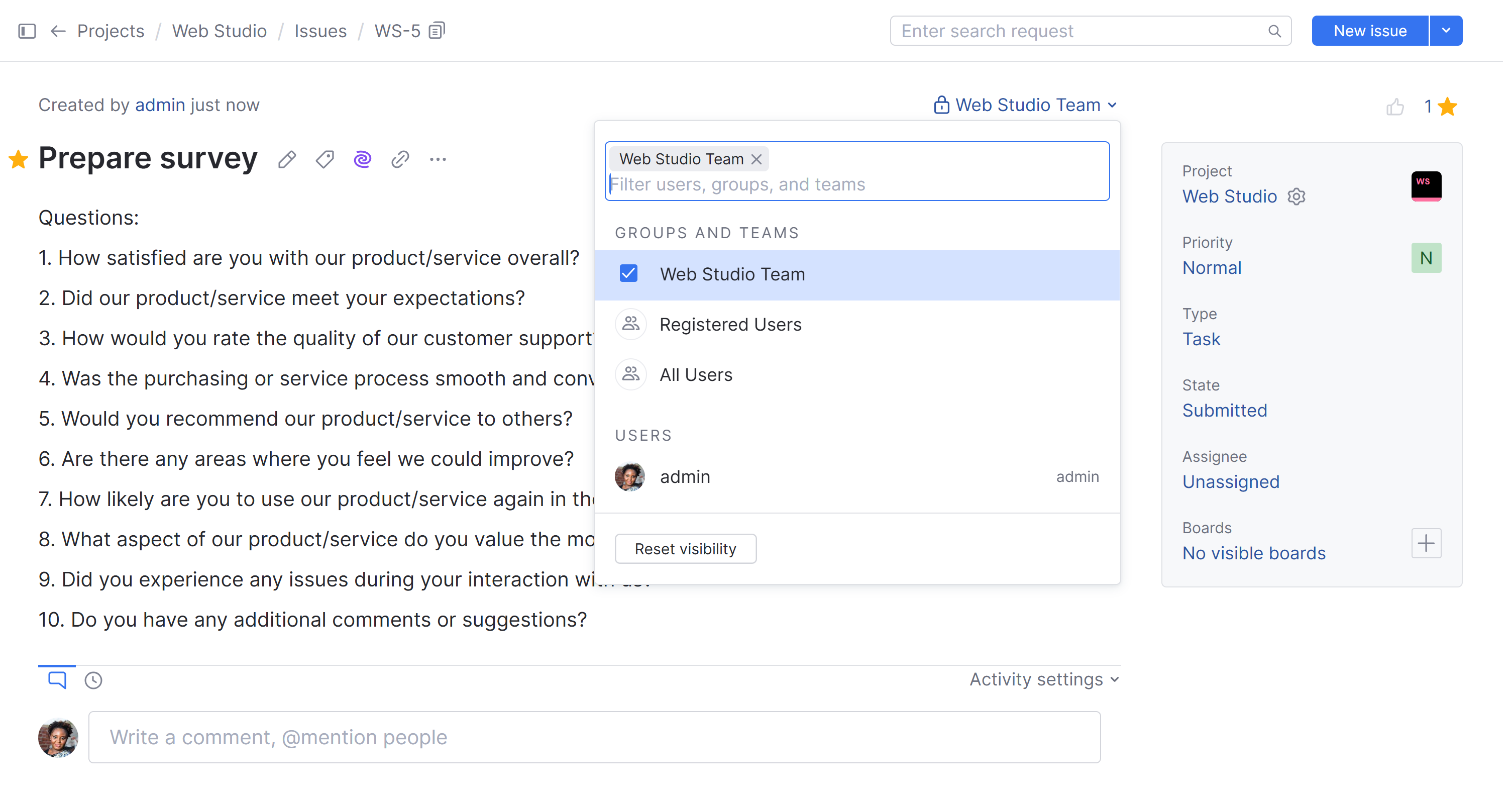 • The issue is created and is only visible to the selected users, groups, and teams.