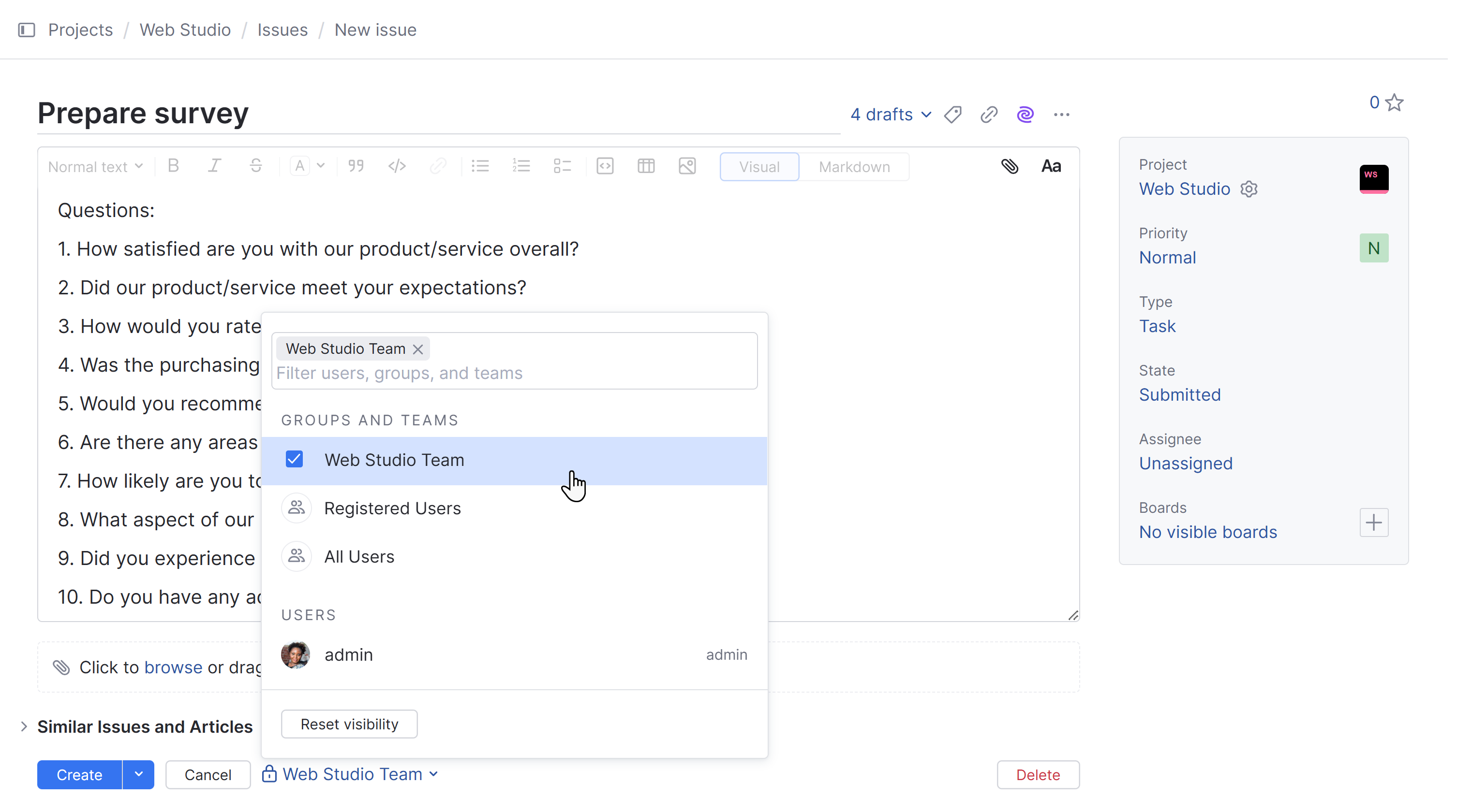 3. In the issue draft, click the Visible to list. This option appears to the right of the Create and Cancel buttons.