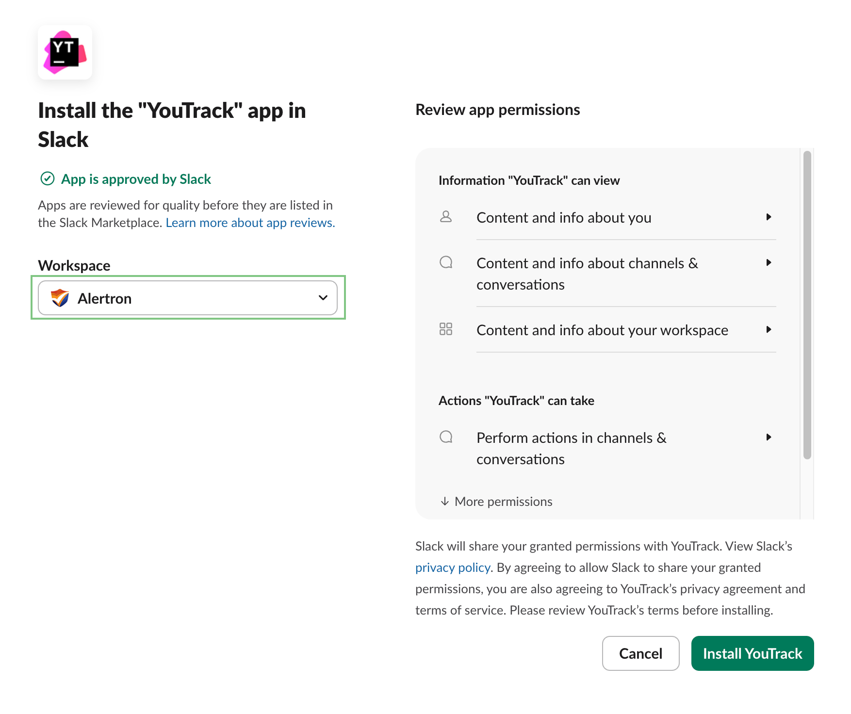 • You are redirected to a page in Slack that lets you install the YouTrack app.
