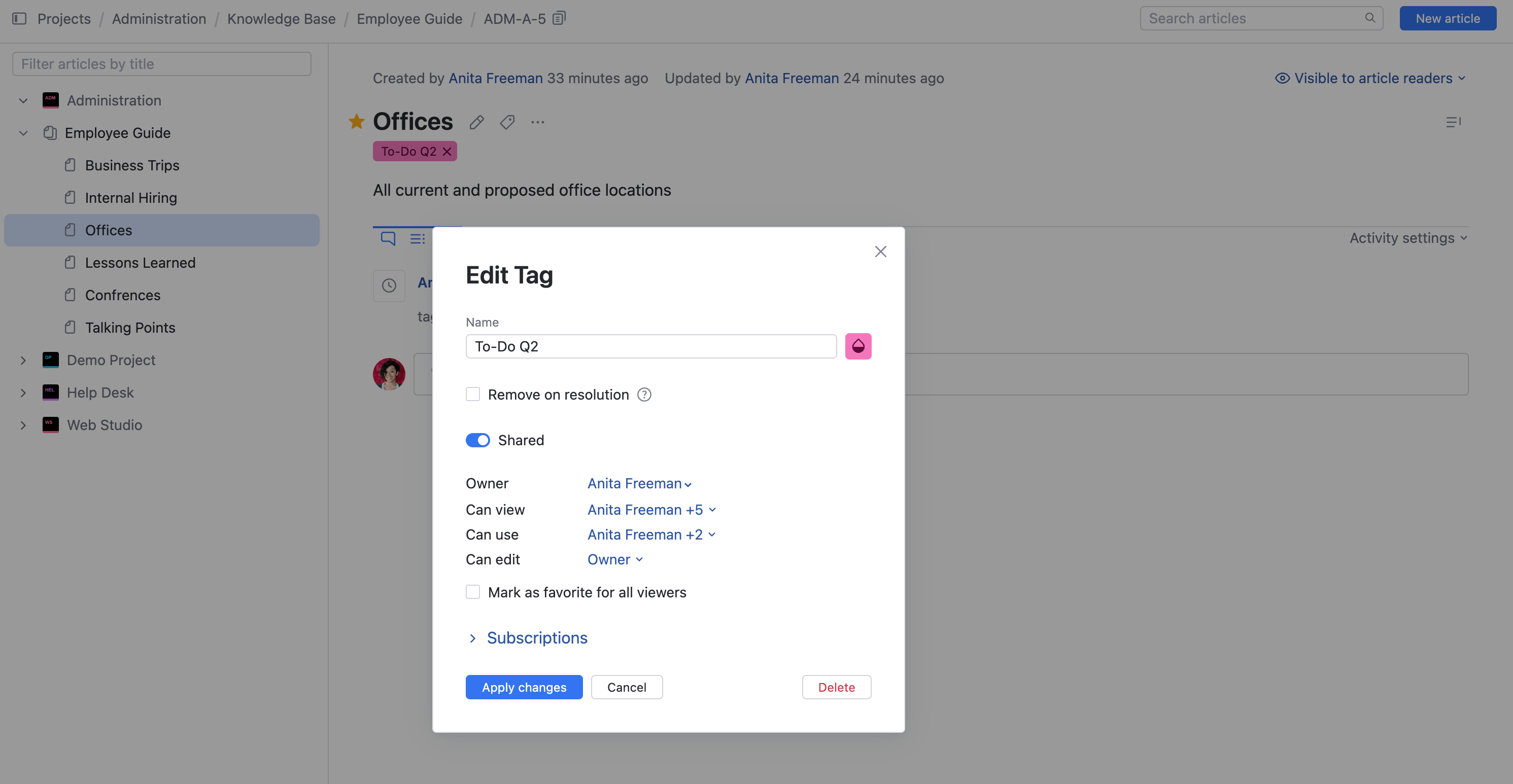 Select which users can see the tag and use it as a filter to search for articles. You can select multiple users, groups, and project teams.