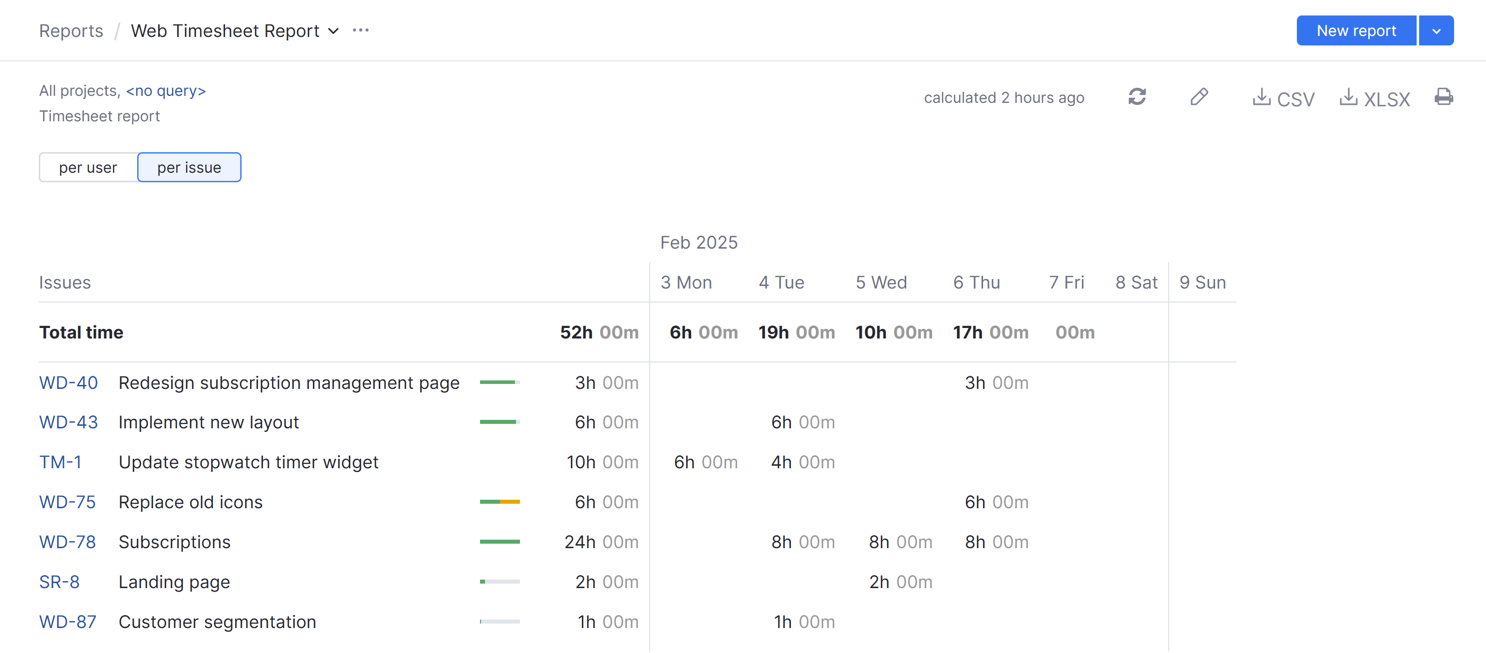 When the report is calculated, you can switch between two views that show spent time per user or per issue. In per issue view, you can click an issue ID to open the selected issue in single issue view. When you configure the report to group the data by Work author, the option to toggle between these two views is hidden.